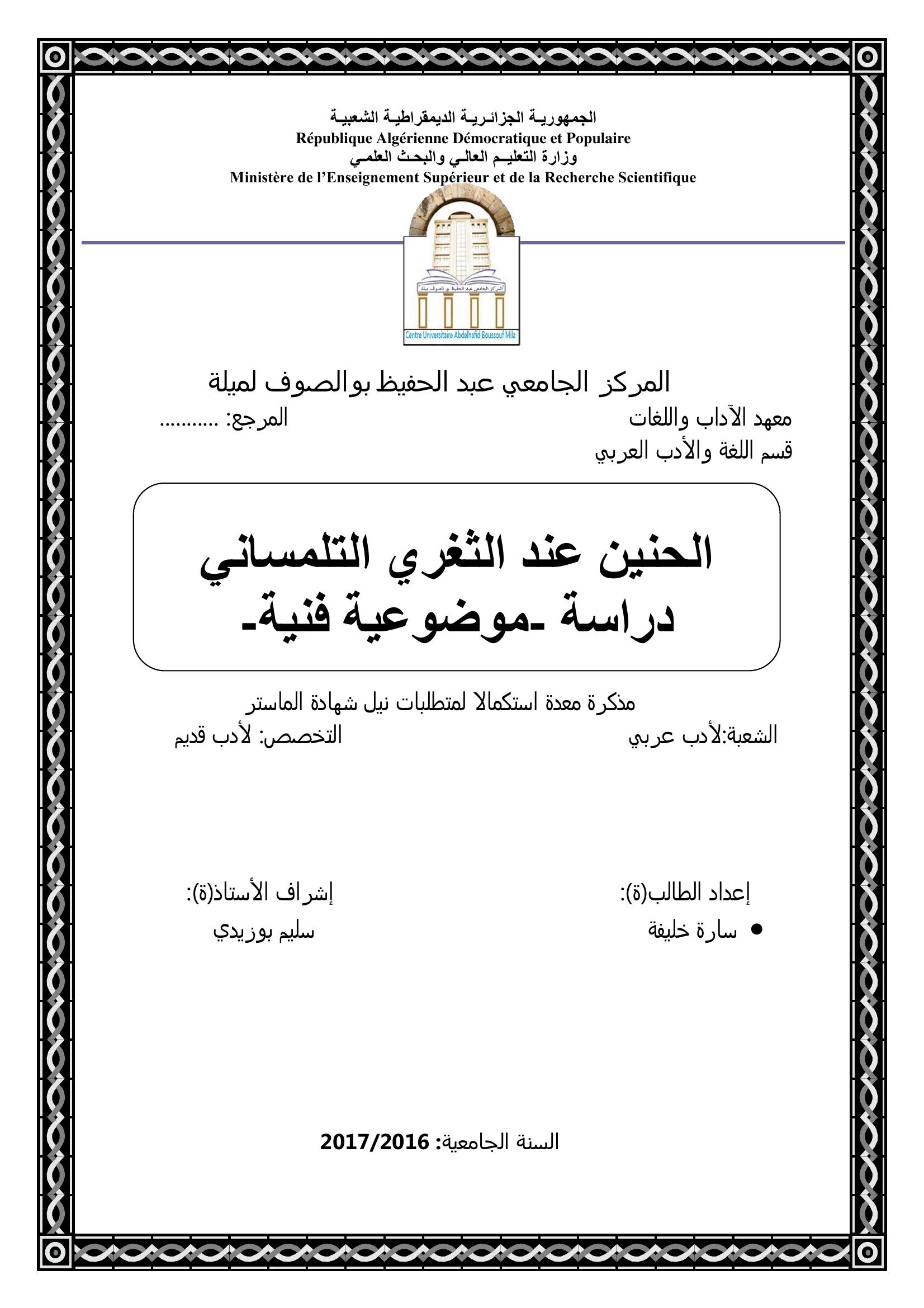 خليفة سارة & بوزيدي سليم (مشرفا) (2017). الحنين عند الثغري التلمساني دراسة موضوعية فنية.