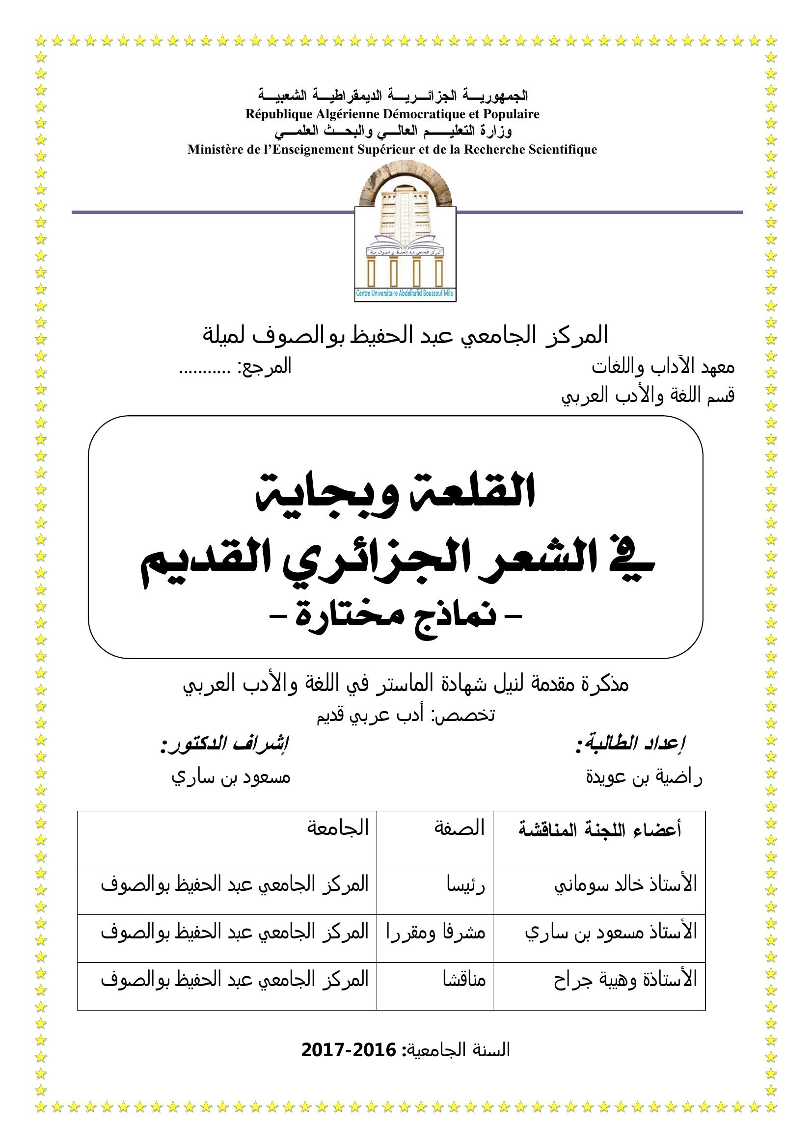 بن عويدة راضية & بن ساري مسعود(مشرفا) (2017). القلعة وبجاية في الشعر الجزائري القديم نماذج مختارة.