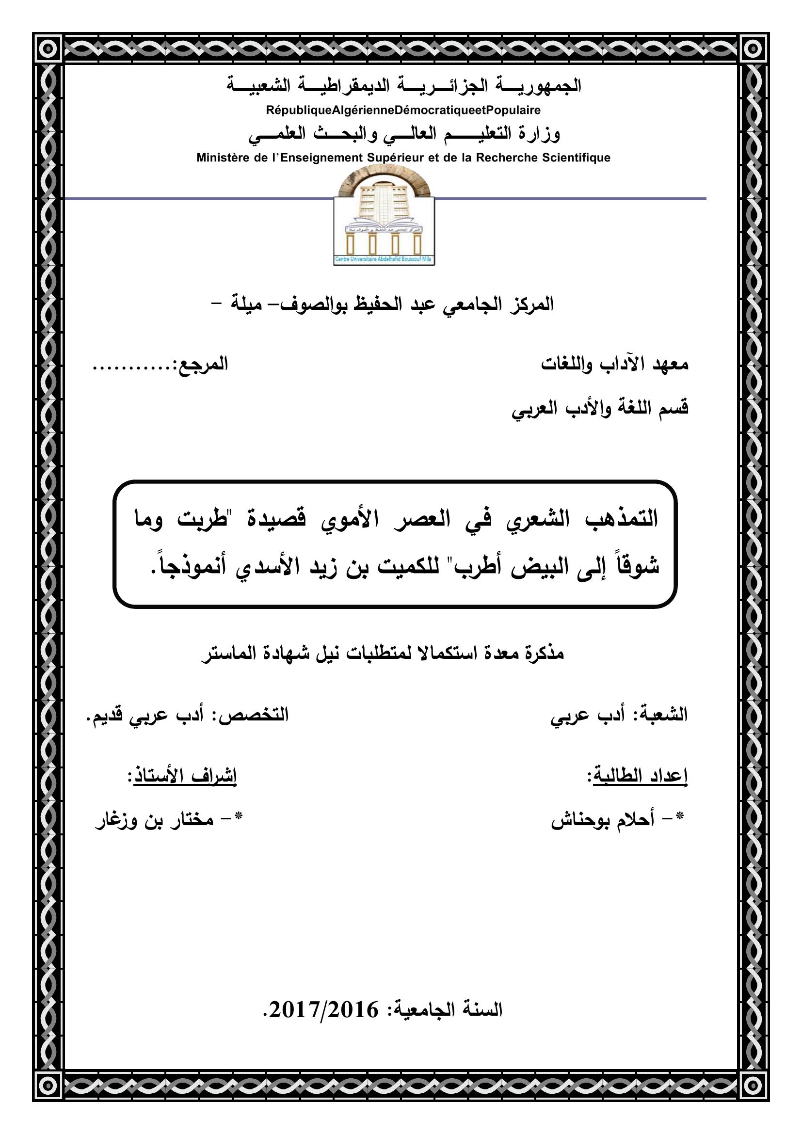 بوحناش أحلام & بن وزغار مختار(مشرفا) (2017). التمذهب الشعري في العصر الأموي قصيدة طربت وما شوقا إلى البيض أطرب الكميت بن زيد الأسدي أنموذجا.