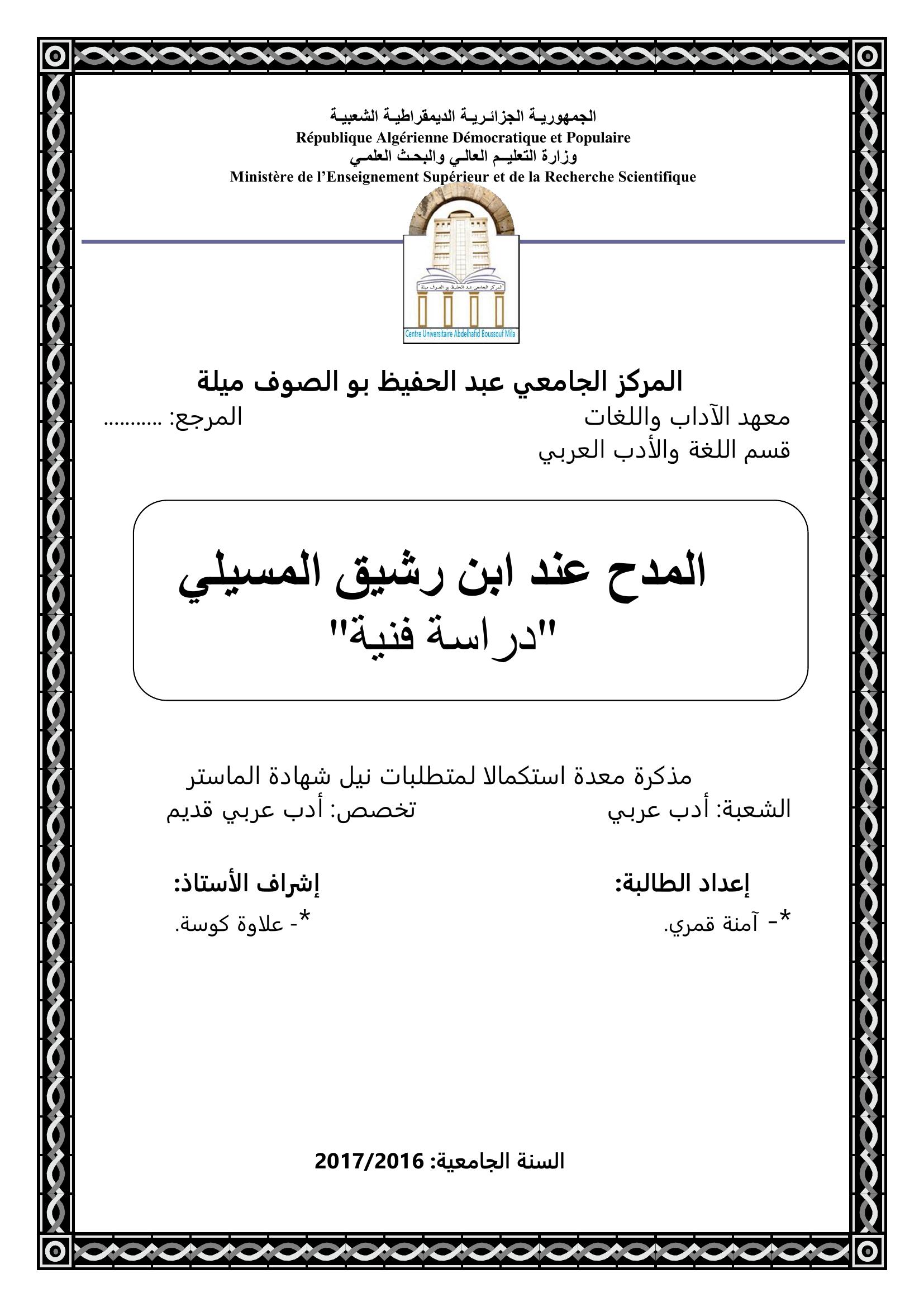 قمري آمنة & كوسة علاوة (مشرفا) (2017). المدح عند ابن رشيق المسيلي دراسة فنية.