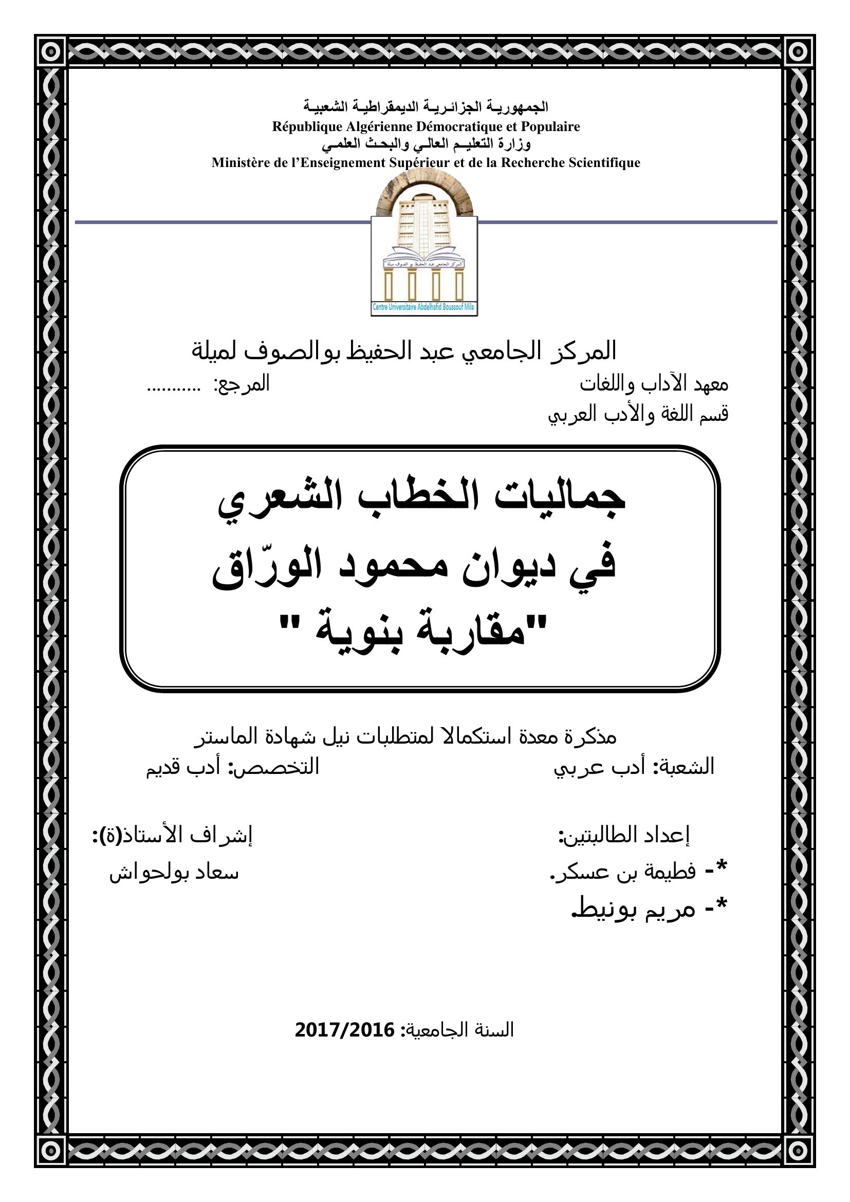 بونيط مريم et al. (2017). جماليات الخطاب الشعري في ديوان محمود الوراق مقاربة بنوية.