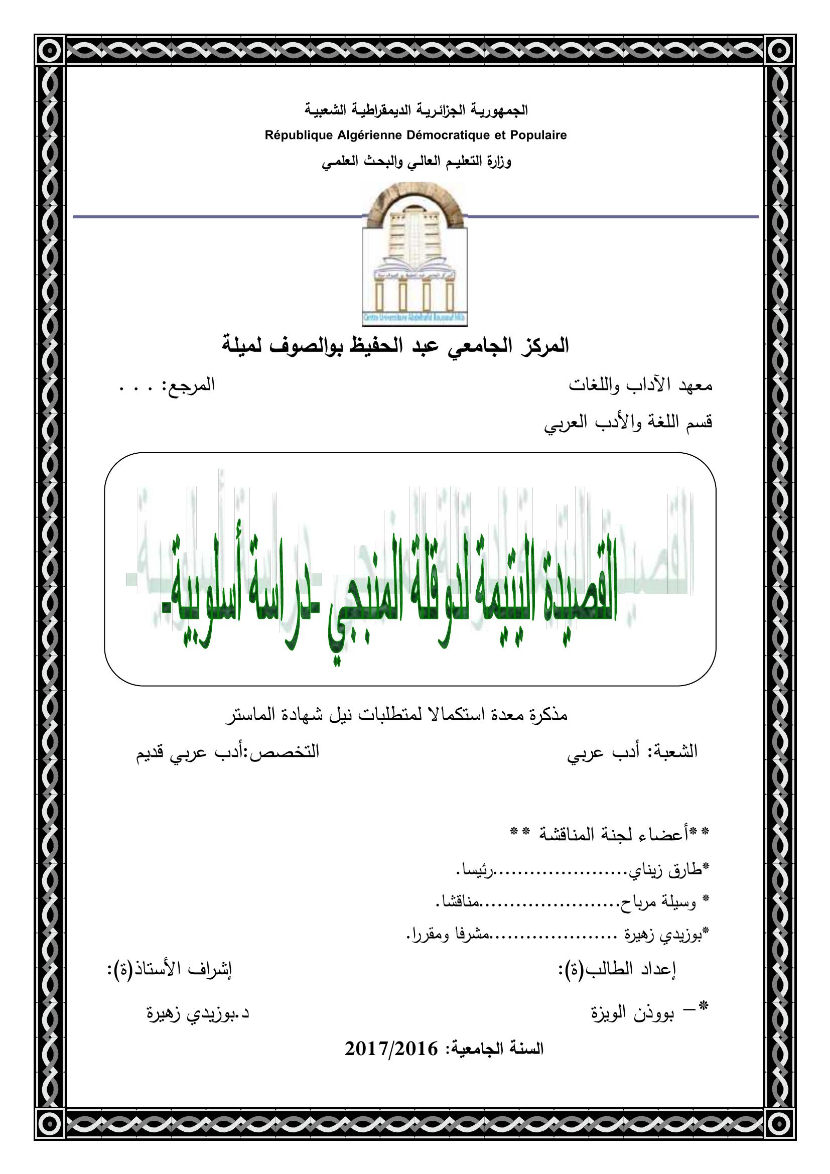 بوذن الويزة & بوزيدي زهيرة (مشرفا) (2017). القصيدة اليتيمة لدوقلة المنبجي دراسة أسلوبية.