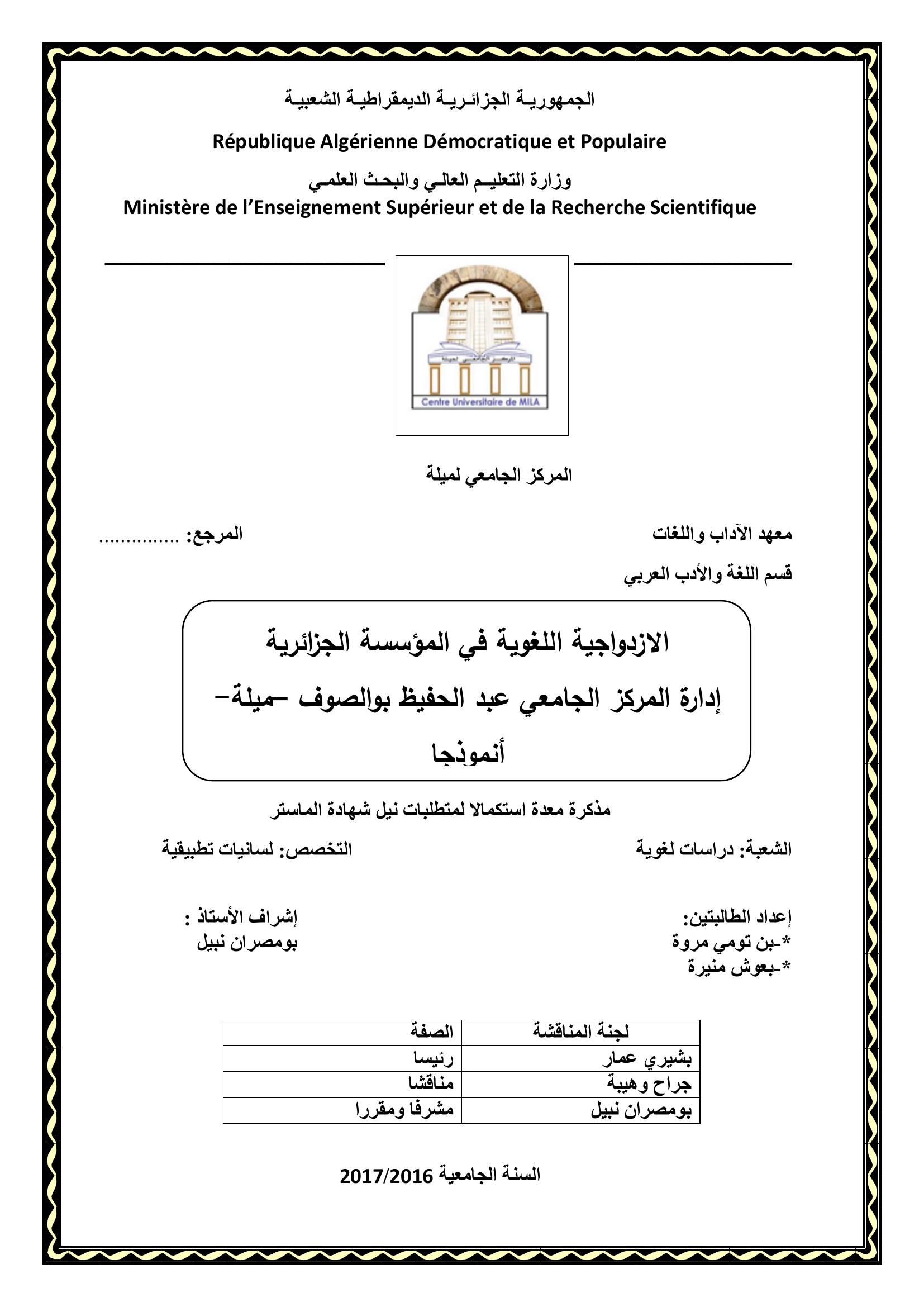 بن تومي مروة & بومصران نبيل (مشرفا) (2017). الإزدواجية اللغوية في المؤسسة الجزائرية إدارة المركز الجامعي عبد الحفيظ بوالصوف ميلة أنموذجا.