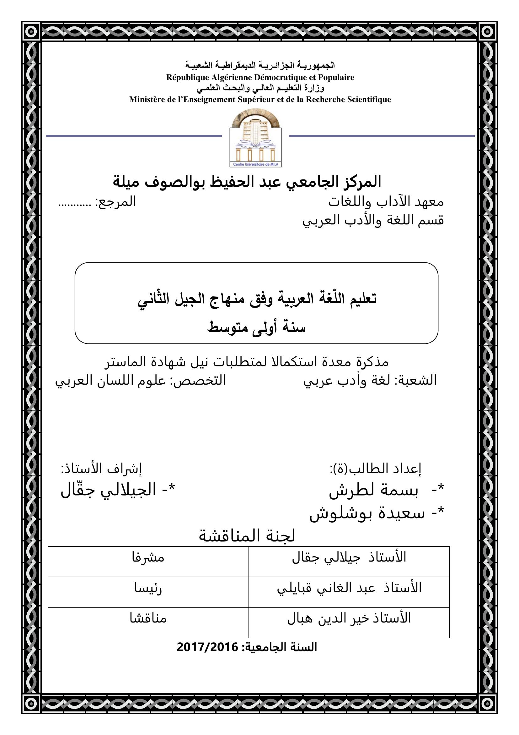 لطرش بسمة & جقال الجيلالي (مشرفا) (2017). تعليم اللغة العربية وفق منهاج الجيل الثاني سنة أولى متوسط.