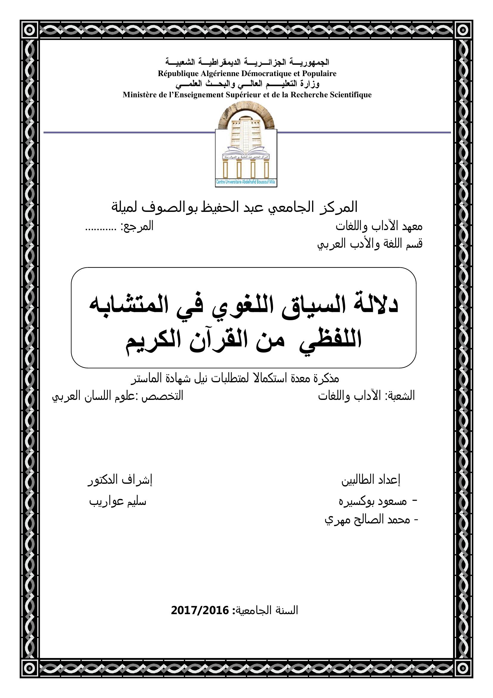بوكسيرة مسعود & عواريب سليم (مشرفا) (2017). دلالة السياق اللغوي في المتشابه اللفظي من القرآن الكريم.