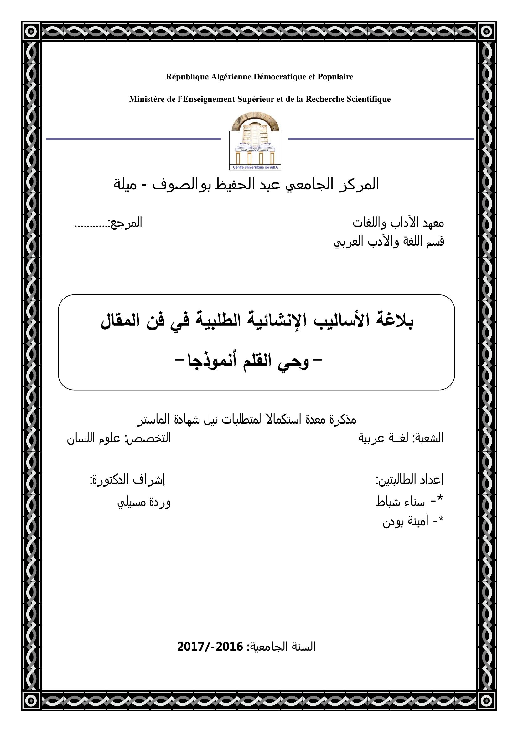 شباط سناء & مسيلي وردة (مشرفا) (2017). بلاغة الأساليب الإنشائية الطلبية في فن المقال وحي القلم أنموذجا.