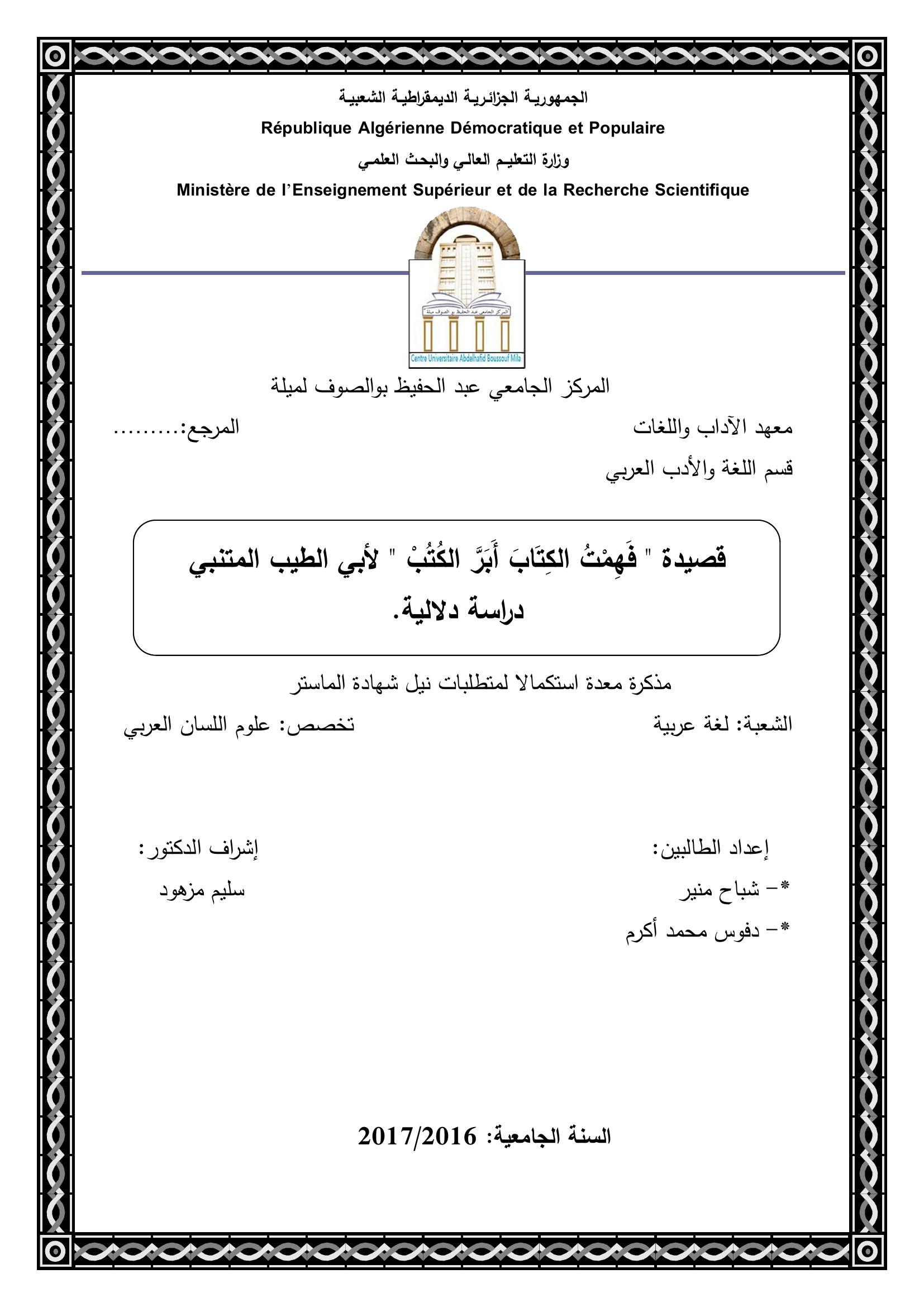 شباح منير & مزهود سليم (مشرفا) (2017). قصيدة فهمت الكتاب أبر الكتب لأبي الطيب المتنبي دراسة دلالية.