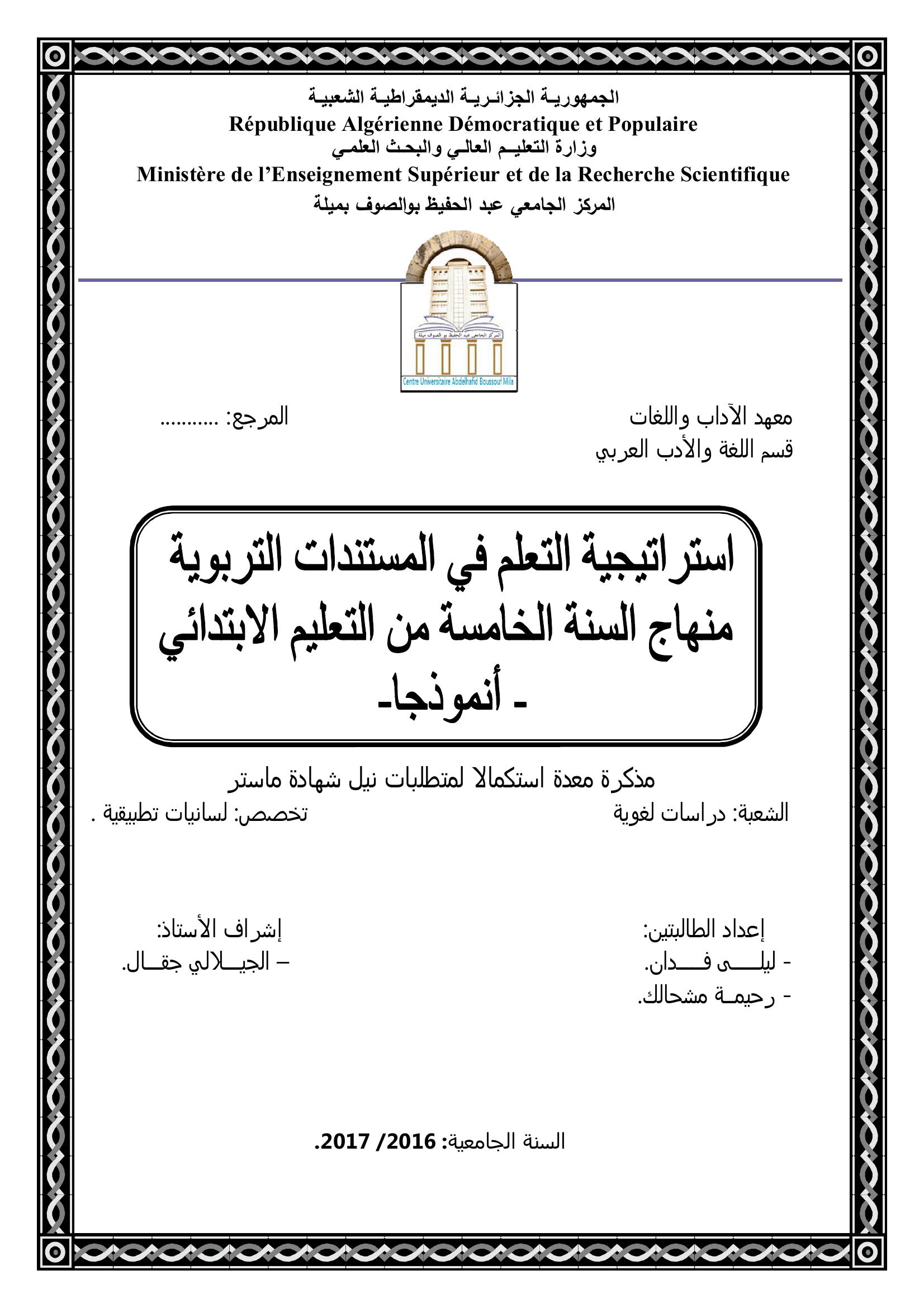 فدان ليلى & جقال الجيلالي (مشرفا) (2017). إستراتيجية التعلم في المستندات التربوية منهاج السنة الخامسة من التعليم الإبتدائي أنموذجا.
