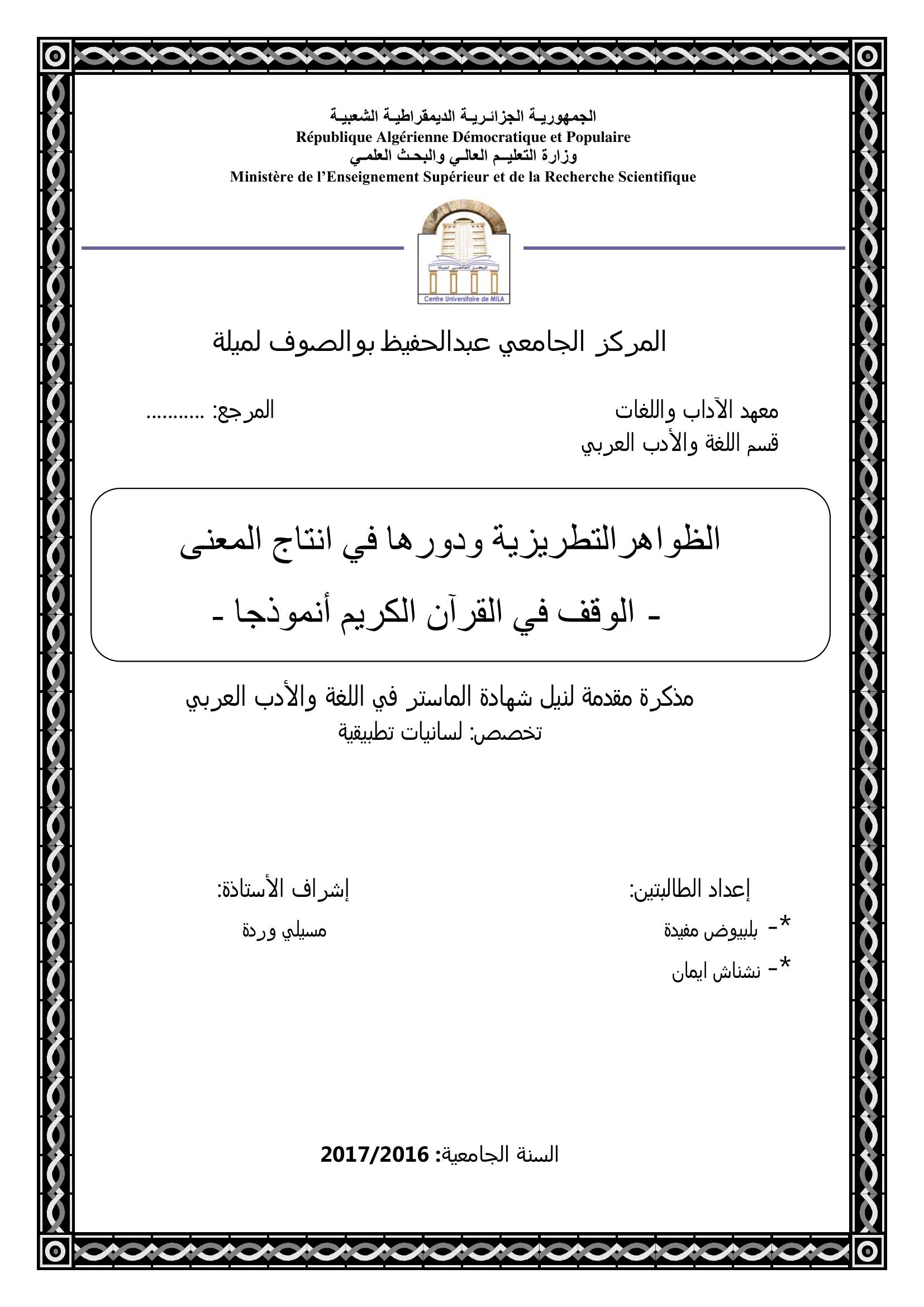 بلبيوض مفيدة & مسيلي وردة (مشرفا) (2017). الظواهر التطريزية ودورها في إنتاج المعنى الوقف في القرآن الكريم أنموذجا.