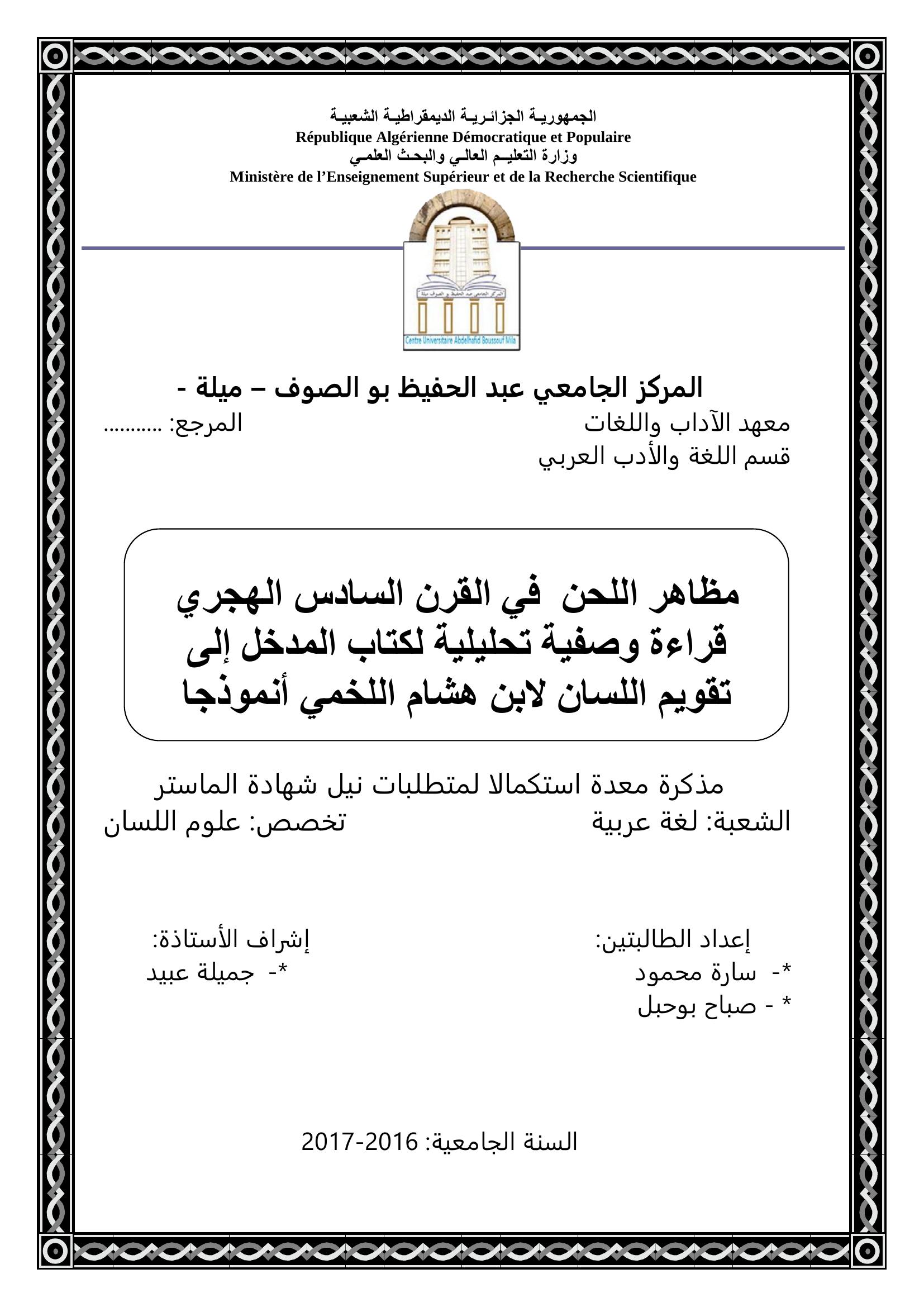 محمود سارة & عبيد جميلة (مشرفا) (2017). مظاهر اللحن في القرن السادس الهجري قراءة وصفية تحليلية لكتاب المدخل إلى تقويم اللسان لإبن هاشم اللخمي أنموذجا.
