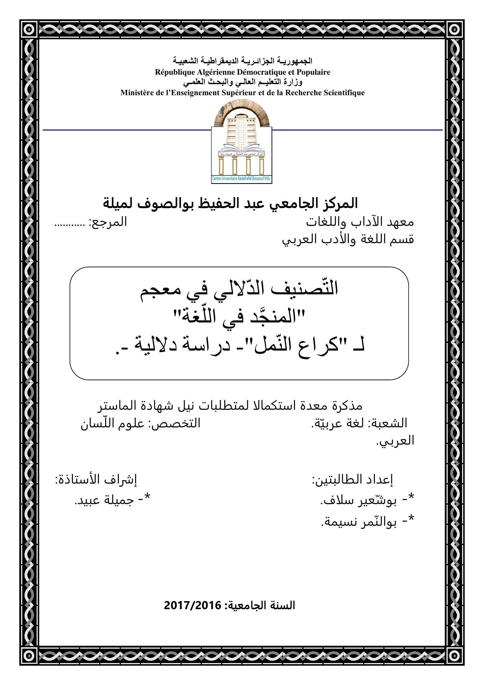 بوشعير سلاف & عبيد جميلة (مشرفا) (2017). التصنيف الدلالي في معجم المنجد في اللغة لكراع النمل دراسة دلالية.