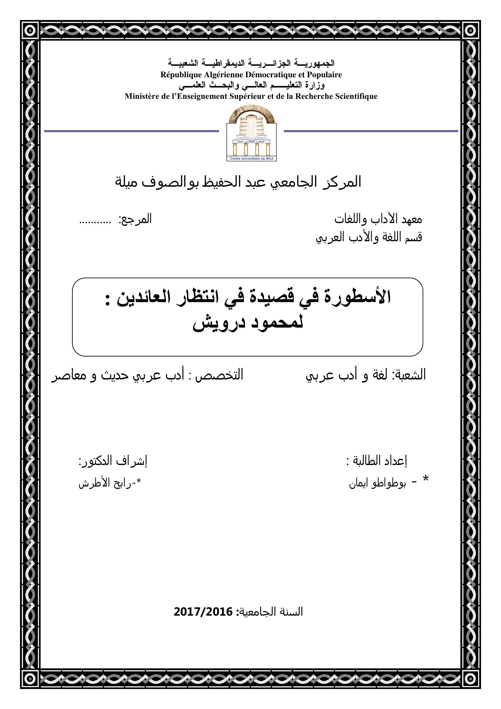 بوطواطو إيمان & الأطرش رابح( مشرفا) (2017). الأسطورة في قصيدة إنتظار العائدين لــ محمود درويش.