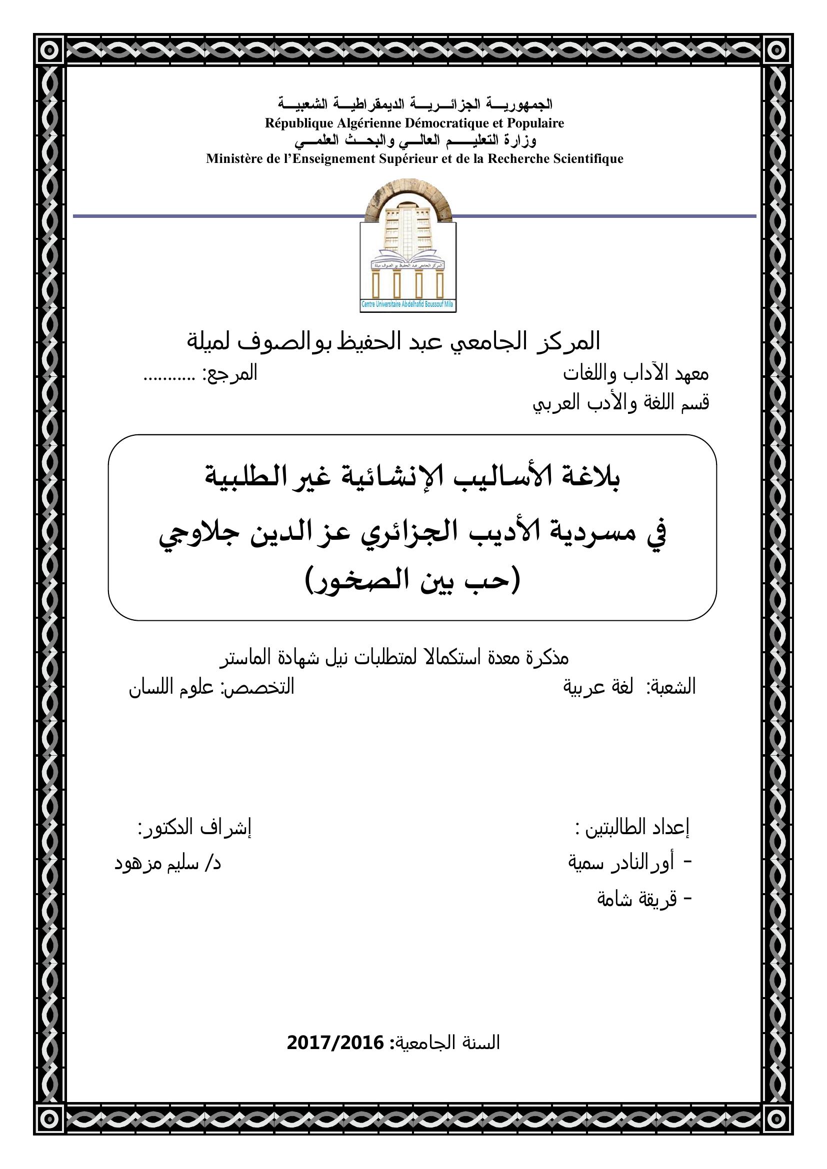 أور النادر سمية & مزهود سليم (مشرفا) (2017). بلاغة الأساليب الإنشائية غير الطلبية في مسردية الأديب.