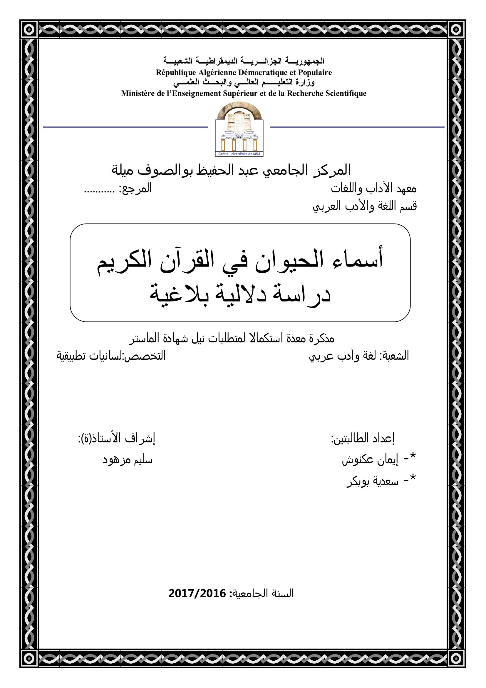 عكنوش إيمان & مزهود سليم (مشرفا) (2017). أسماء الحيوان في القرآن الكريم دراسة دلالية بلاغية.