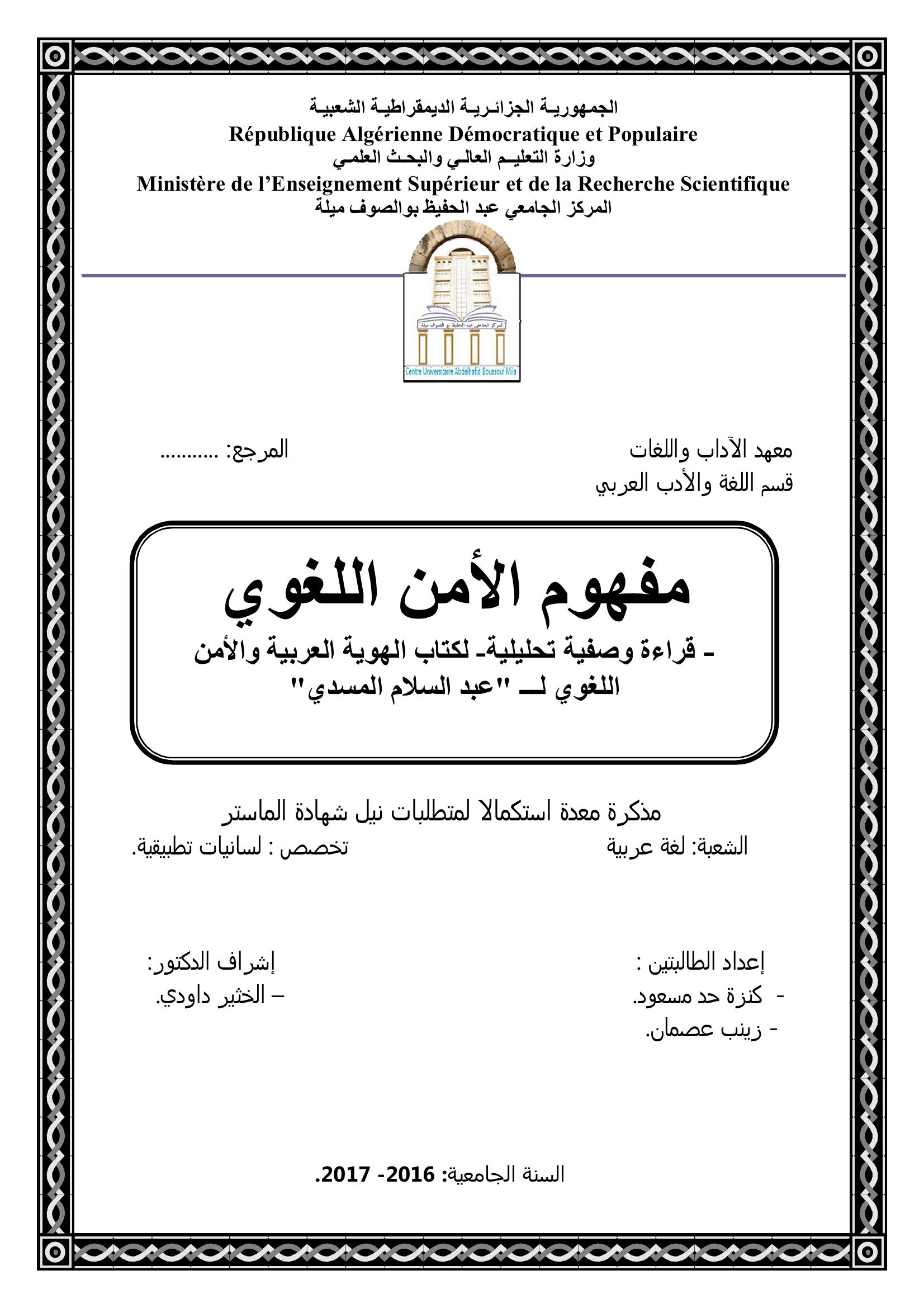 حد مسعود كنزة & داودي الخثير (مشرفا) (2017). مفهوم الأمن اللغوي قراءة وصفية تحليلية نقدية لكتاب الهوية العربية والأمن اللغوي لـ عبد السلام المسدي.
