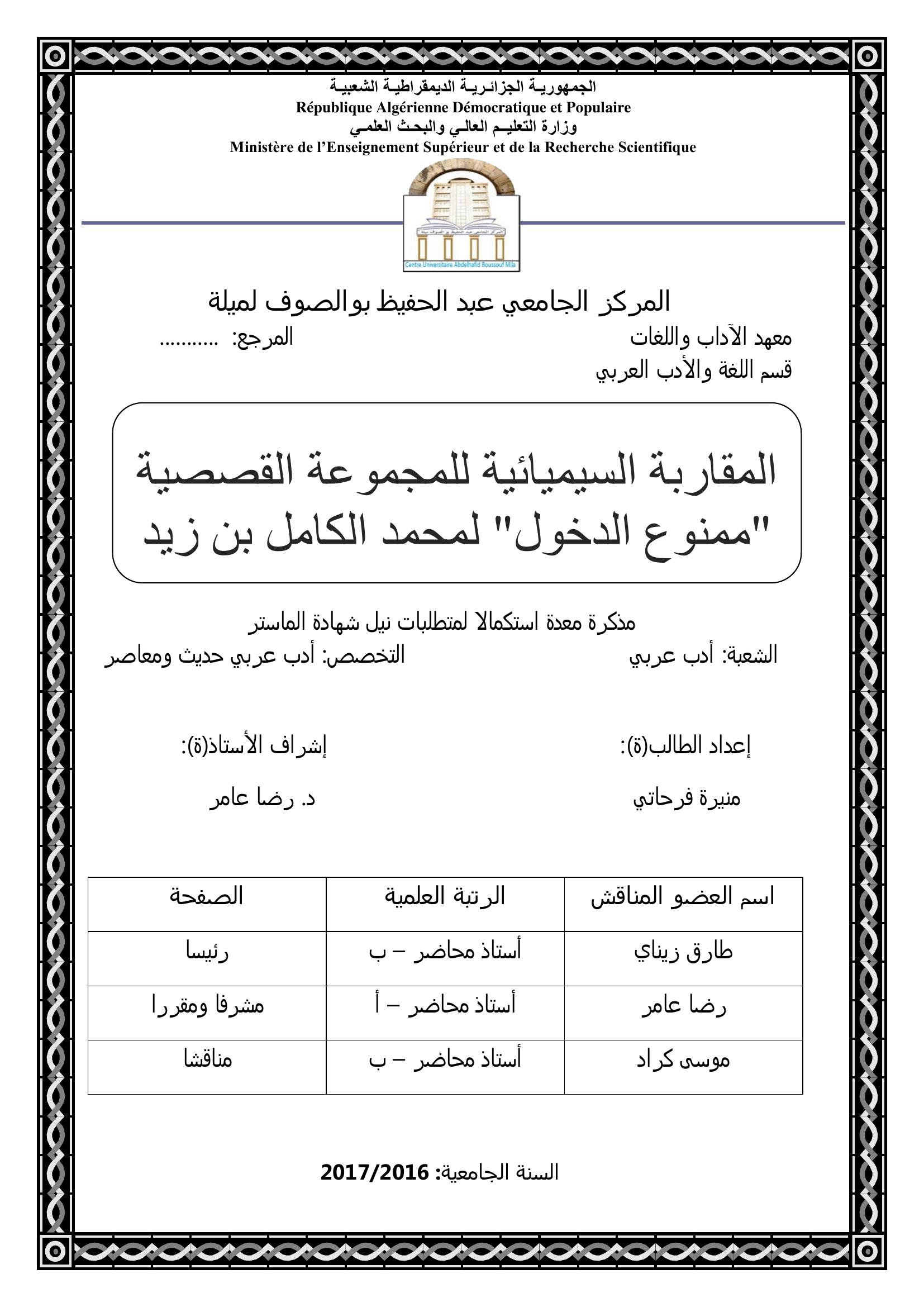 فرحاتي منيرة & عامر رضا (مشرفا) (2017). المقاربة السيميائية للمجموعة القصصية ممنوع الدخول لمحمد الكامل بن زيد.