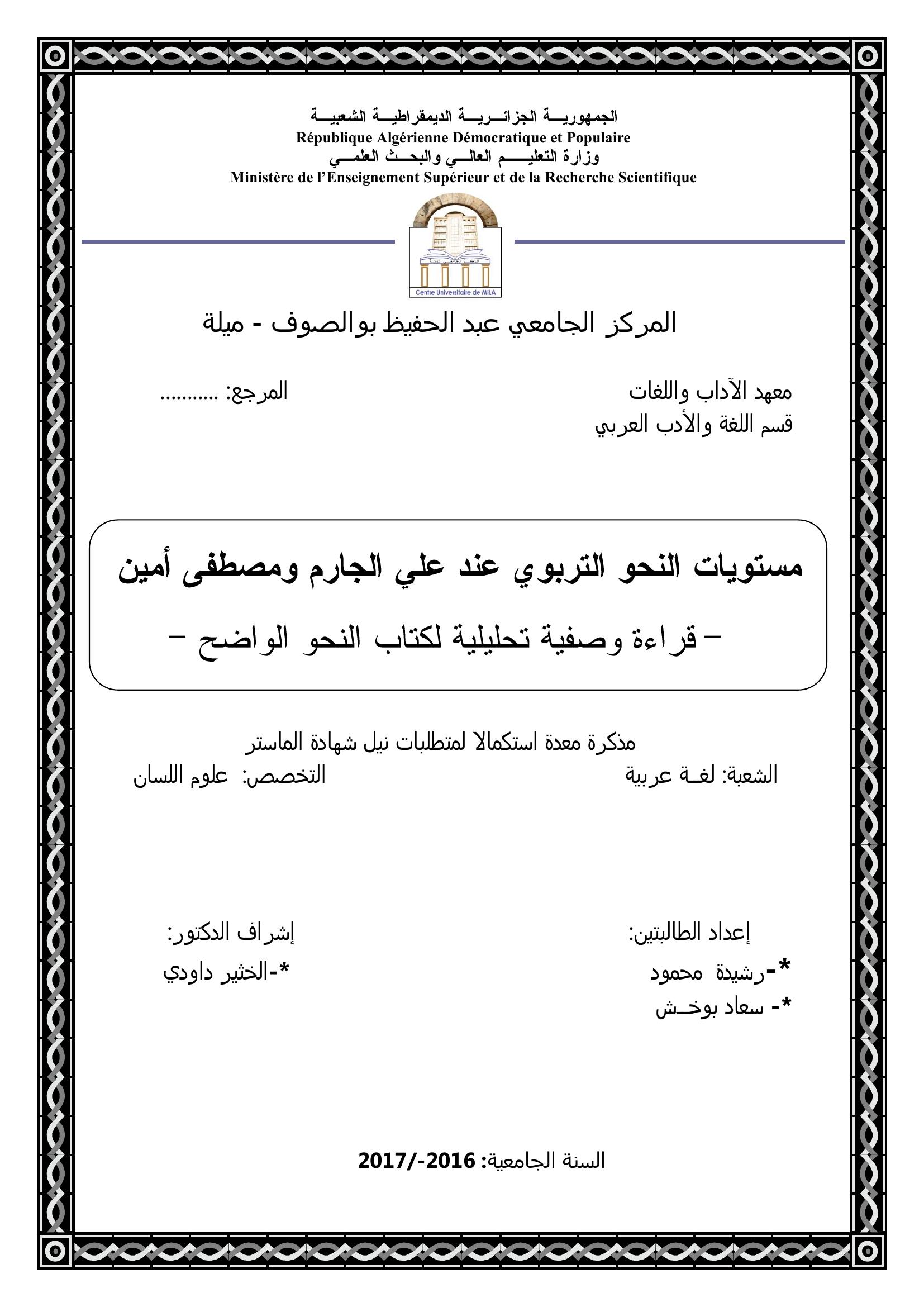 محمود رشيدة & داودي الخثير (مشرفا) (2017). مستويات النحو التربوي عند علي الجارم ومصطفى أمين قراءة وصفية تحليلية لكتاب النحو الواضح.