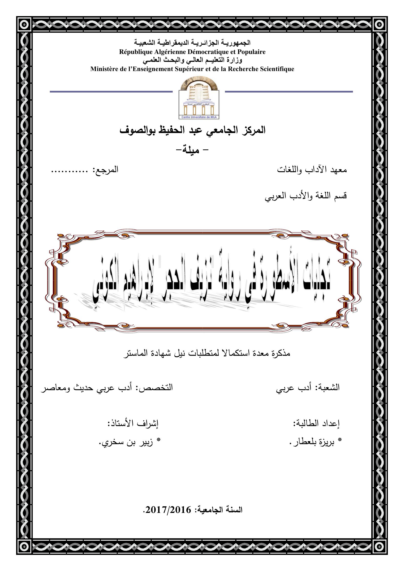 بلعطار بريزة & بن صخري الزبير( مشرفا) (2017). تجليات الأسطورة في رواية نزيف الحجر لإبراهيم الكوني.