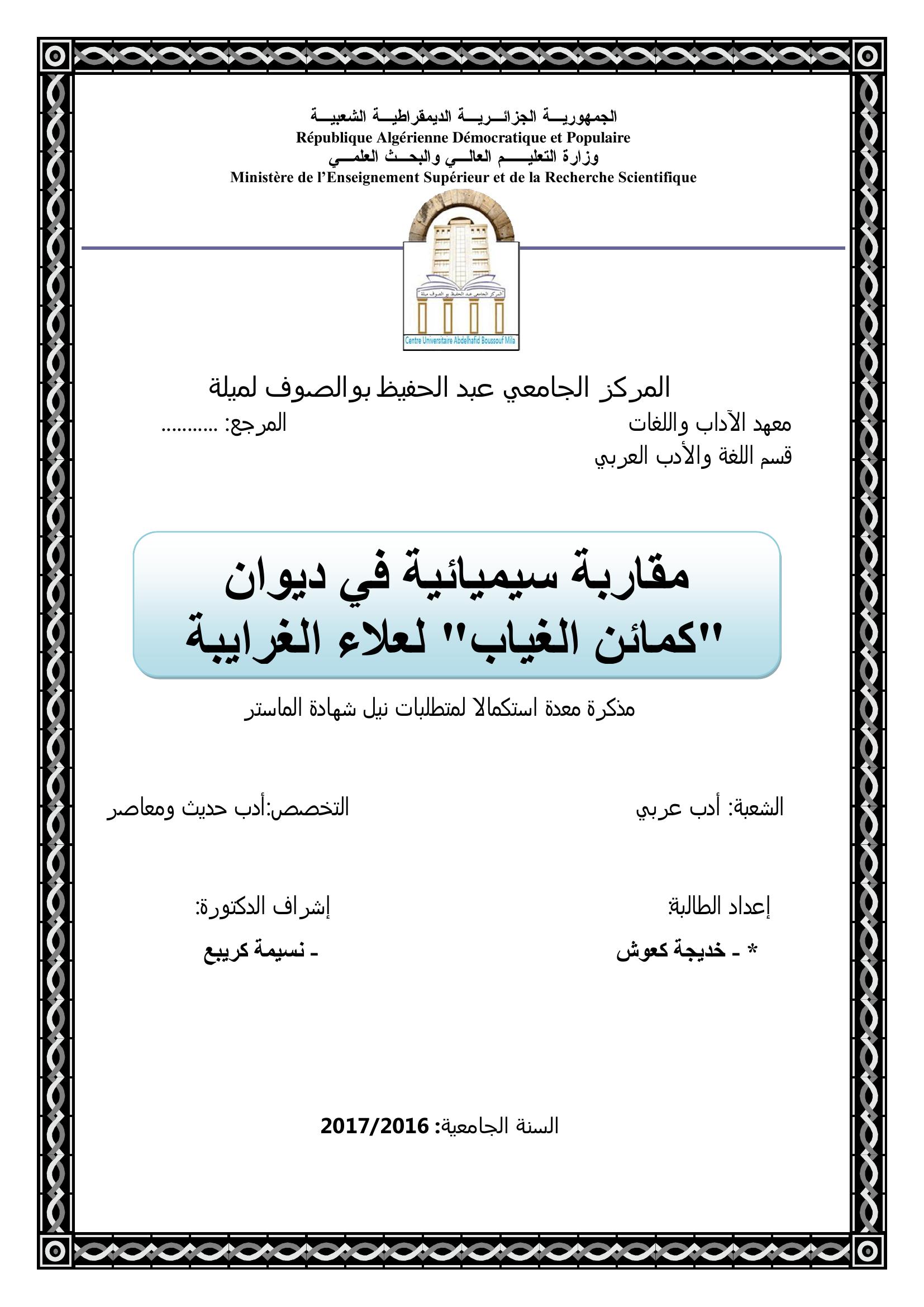 كعوش خديجة & كريبع نسيمة (مشرفا) (2017). مقاربة سيميائية في ديوان كمائن الغياب لعلاء الغرايبة.