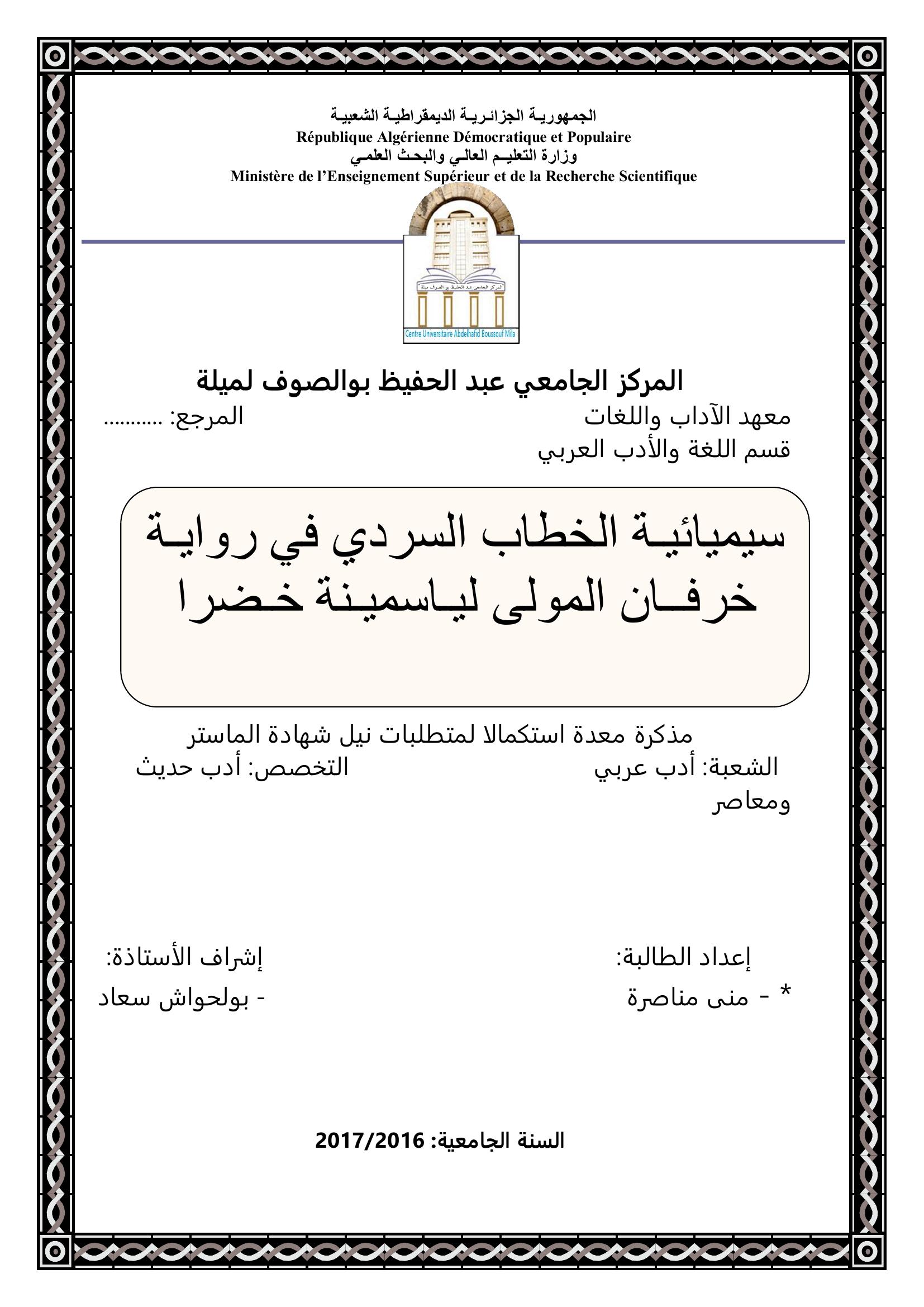 مناصرة منى & بولحواش سعاد (مشرفا ) (2017). سيميائية الخطاب السردي في رواية خرفان المولى لياسمينة خضرا.