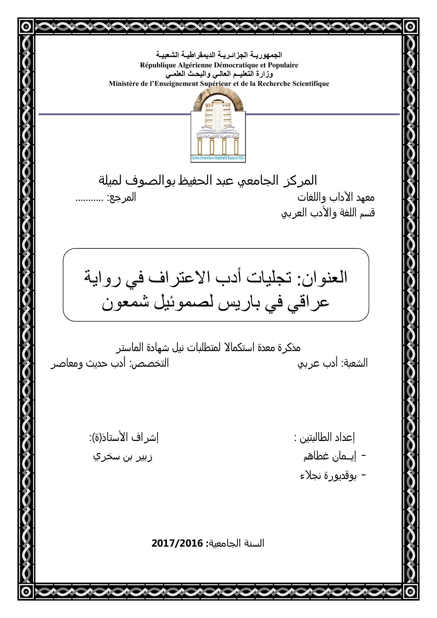 غطاهم إيمان & بن صخري الزبير( مشرفا) (2017). تجليات أدب الإعتراف في رواية عراقي في باريس لصموئيل شمعون.