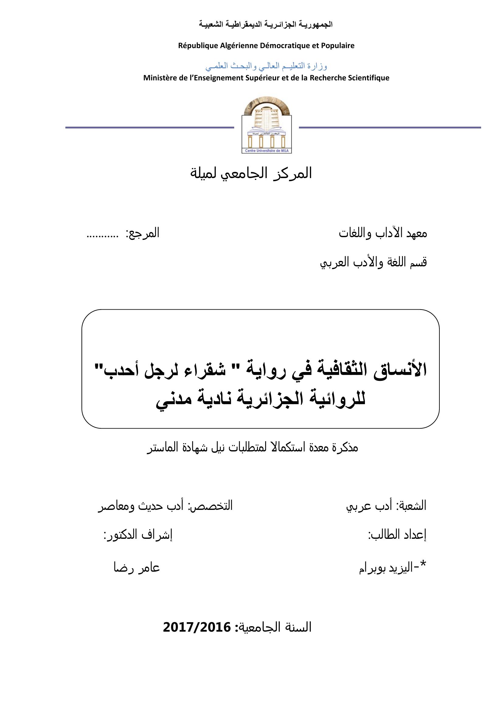 بوبرام اليزيد & عامر رضا (مشرفا) (2017). الأنساق الثقافية في رواية شقراء لرجل أحدب للروائية الجزائرية نادية مدني.