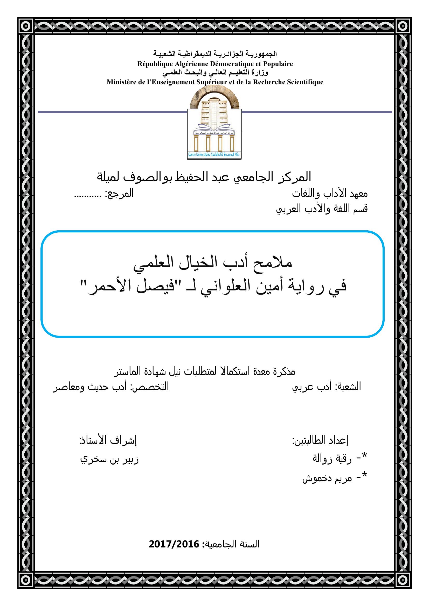 زوالة رقية & بن صخري الزبير( مشرفا) (2017). ملامح أدب الخيال العلمي في رواية أمين العلواني لفيصل الأحمد.
