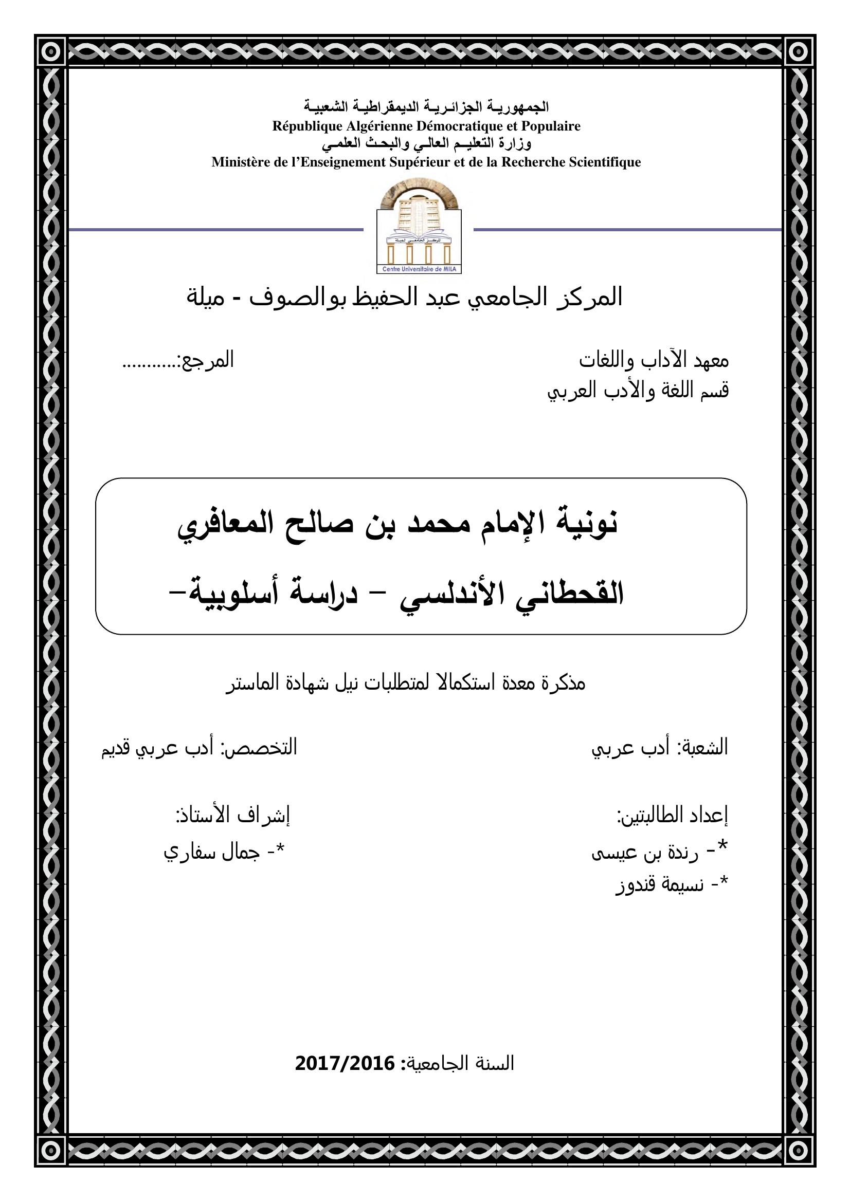 بن عيسى رندة & سفاري جمال (مشرفا) (2017). نونية الإمام محمد بن صالح المعافري القحطاني الأندلسي دراسة أسلوبية.