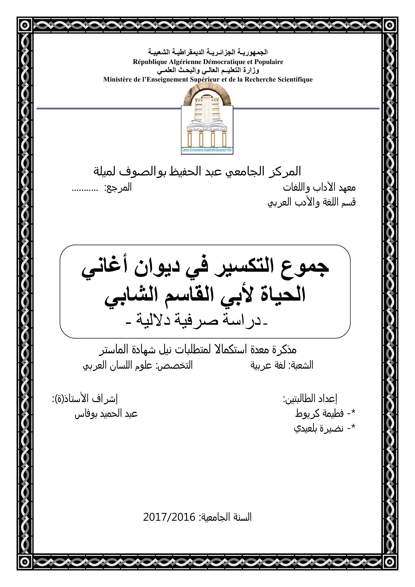 كريوط فطيمة & بوفاس عبد الحميد(مشرفا) (2017). جموع التكسير في ديوان أغاني الحياة لأبي القاسم الشابي دراسة صرفية دلالية.