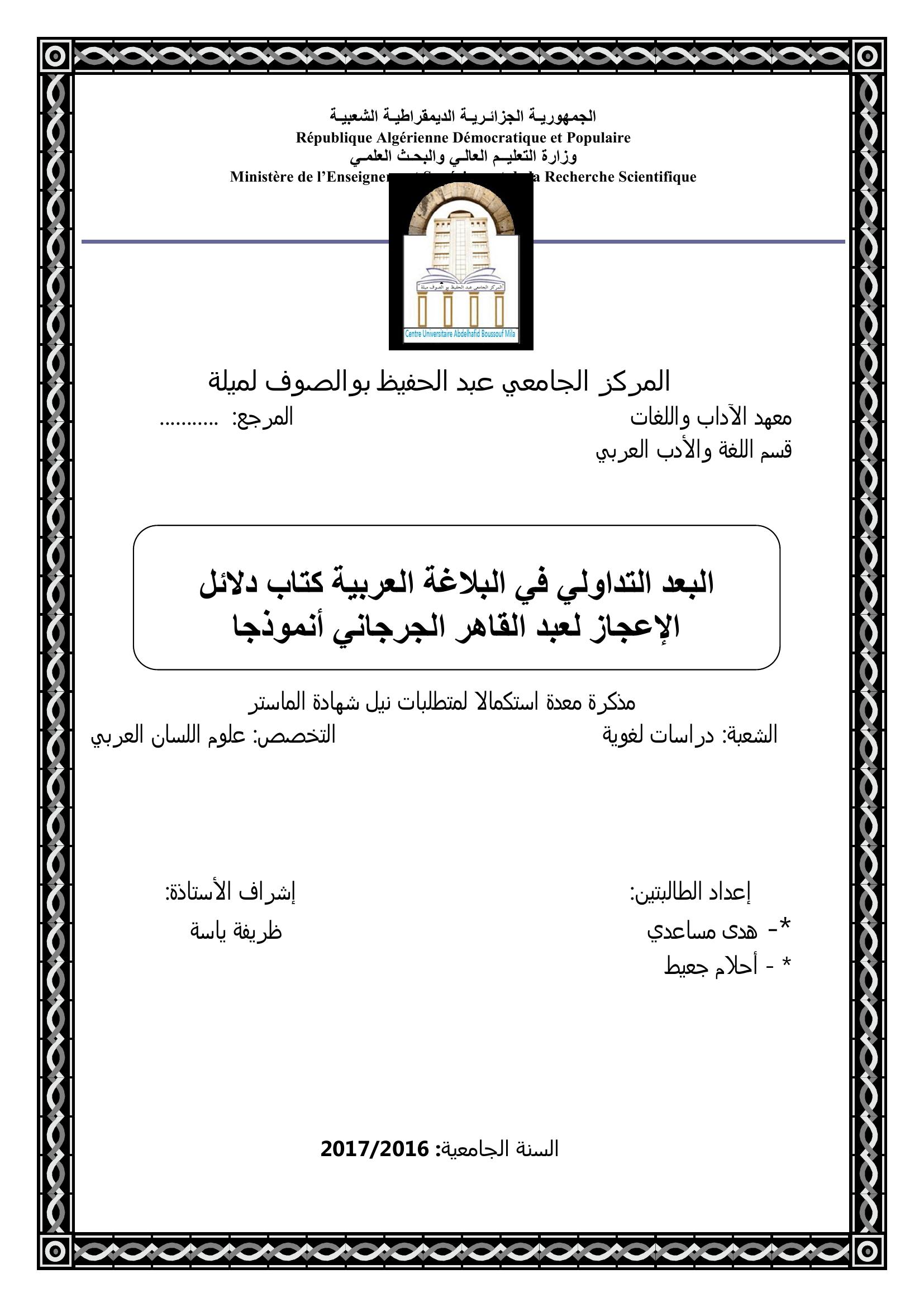 مساعدي هدى & ياسة ظريفة (مشرفا) (2017). البعد التداولي في البلاغة العربية كتاب دلائل الإعجاز لعبد القاهر الجرجاني أنموذجا.