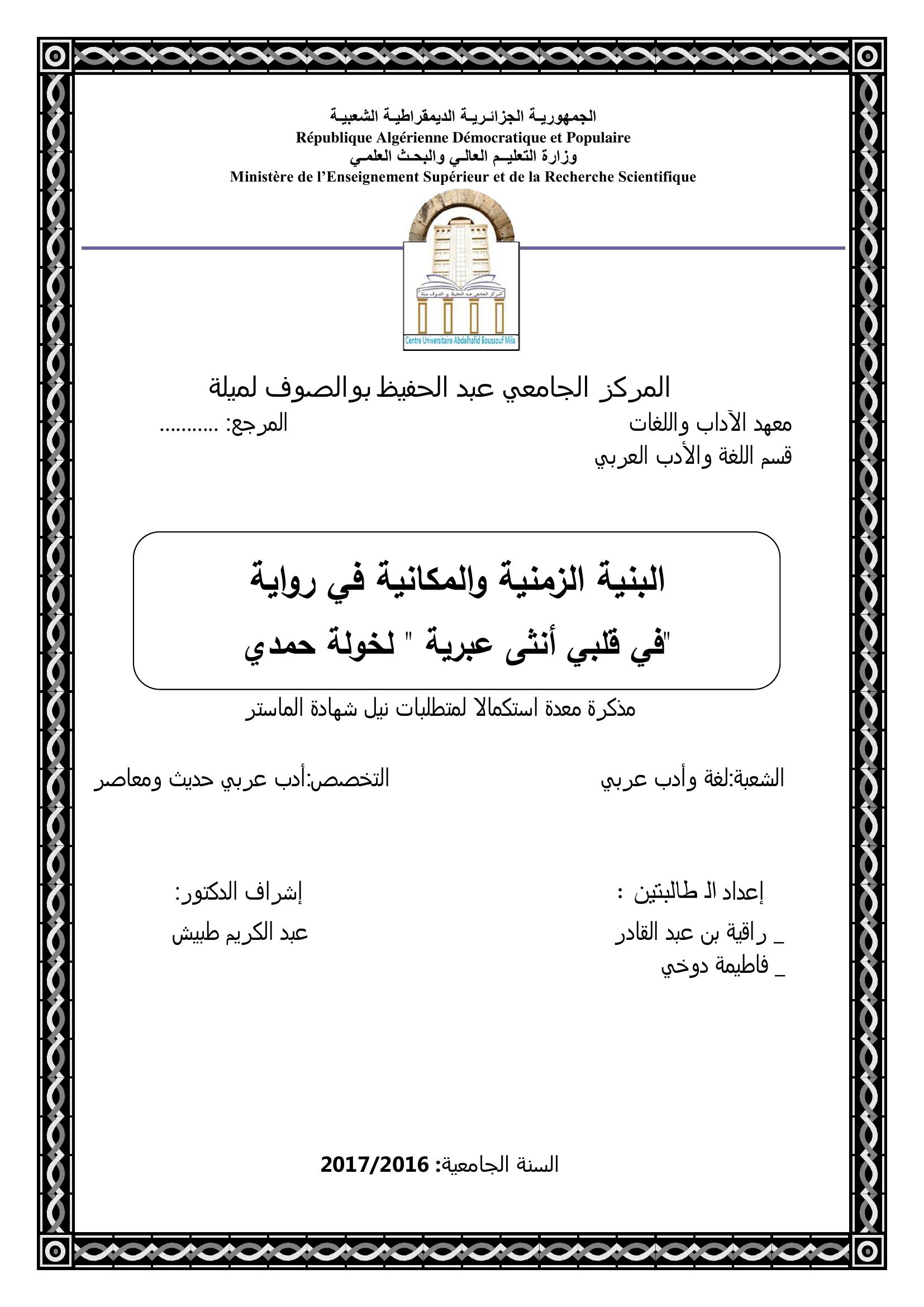 بن عبد القادر راقية & طبيش عبد الكريم(مشرفا) (2017). البنية الزمنية والمكانية في رواية في قلبي أنثى عبرية لـ خولة حمدي.