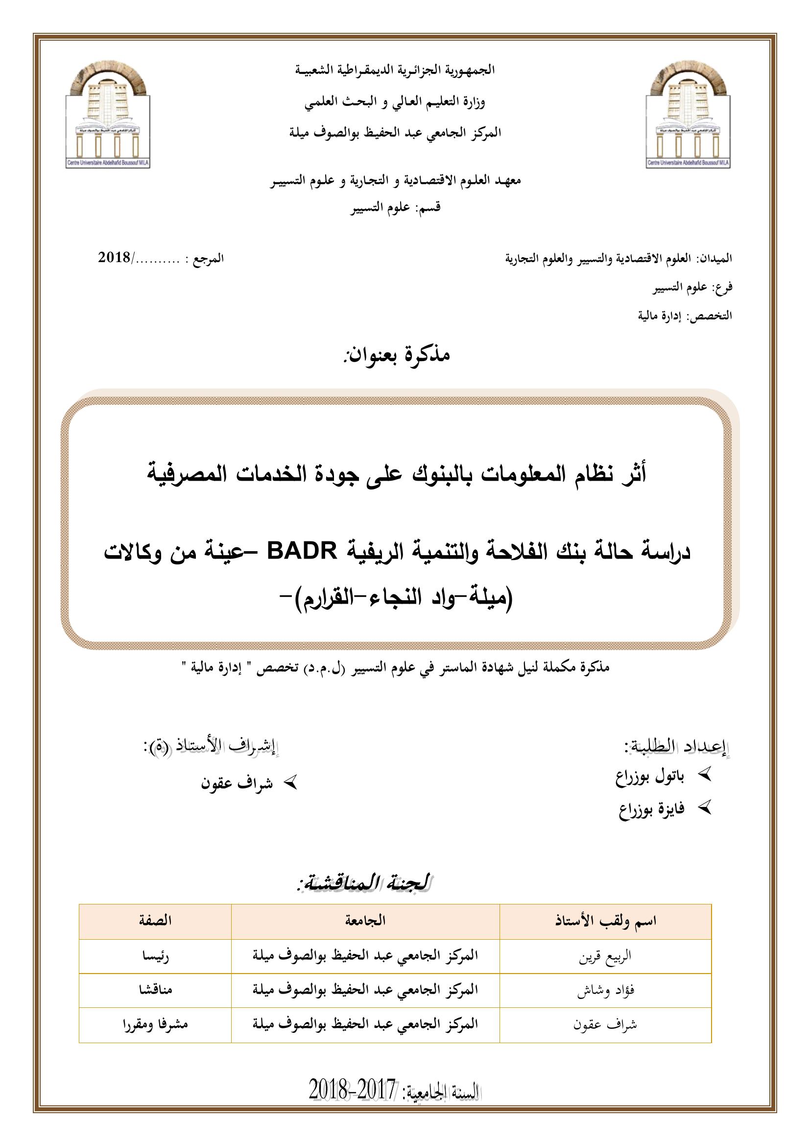 بوزراع باتول & قرين الربيع (رئيسا)، وشاش فؤاد (مناقشا)،عقون شراف (مشرفا ومقررا)، (2018). أثر نظام المعلومات بالبنوك على جودة الخدمات المصرفية : دراسة حالة بنك الفلاحة و التنمية الريفية BADR عينة من وكالات (ميلة -واد النجاء-القرارم).