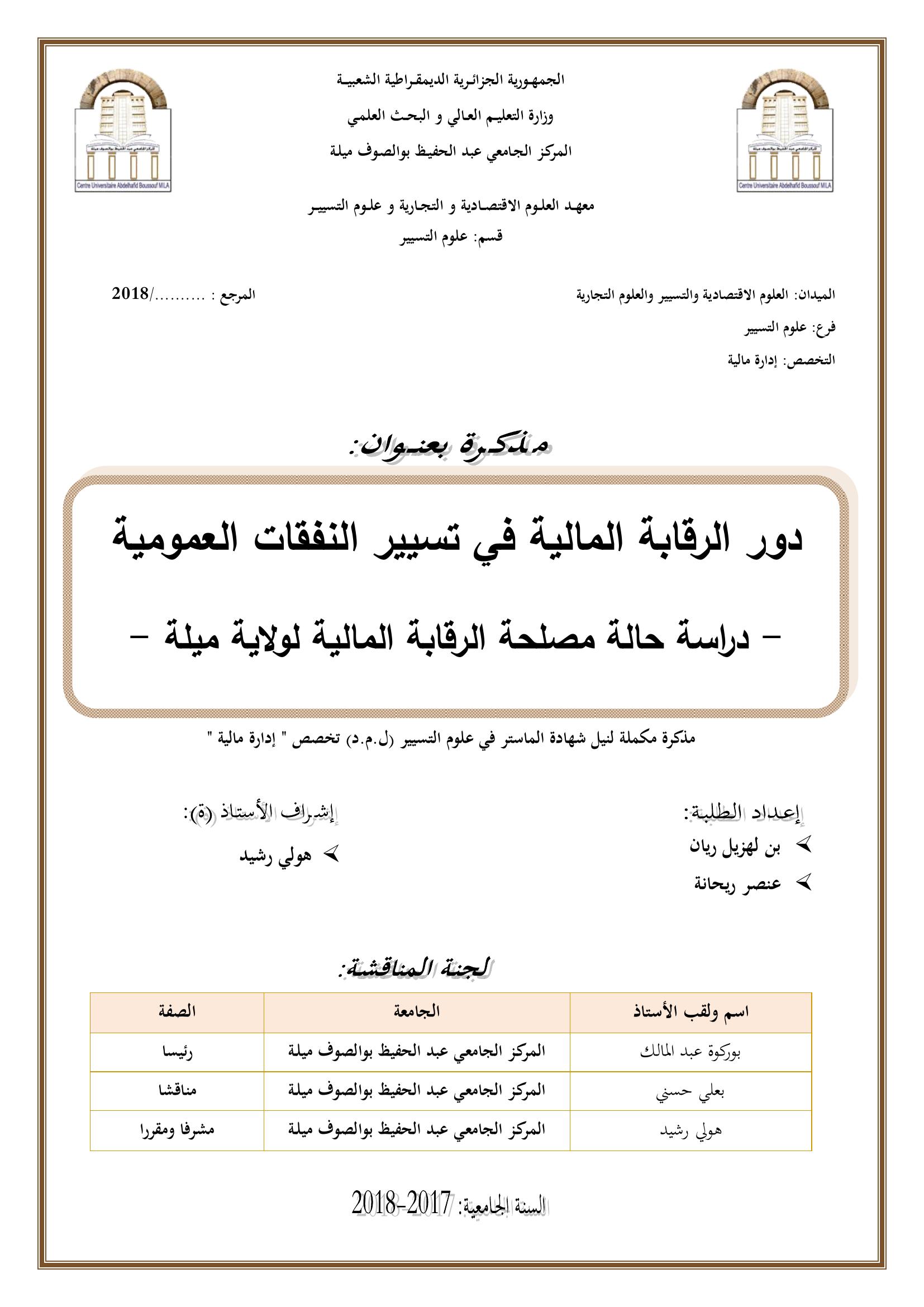 بن لهزيل ريان & بوركوة عبد المالك (رئيسا)، بعلي حسني(مناقشا) ، هولي رشيد (مشرفا ومقررا) (2018). دور الرقابة المالية في تسيير النفقات العمومية : دراسة حالة مصلحة الرقابة المالية لولاية ميلة.
