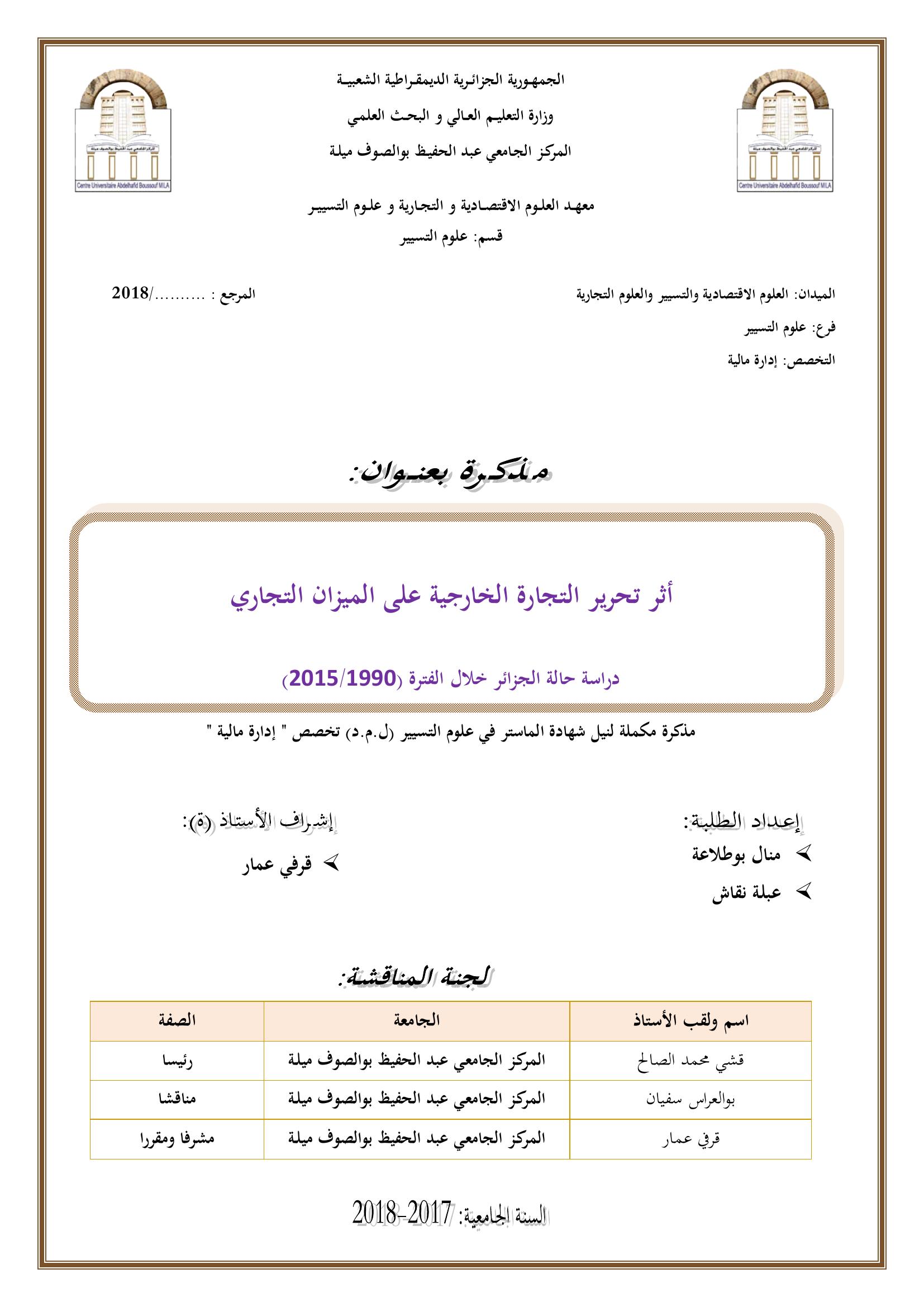 بوطلاعة منال & قشي محمد الصالح(رئيسا) ، بوالعراس سفيان (مناقشا) ، قرفي عمار(مشرفا ومقررا) (2018). أثر تحرير التجارة الخارجية على الميزان التجاري : دراسة حالة الجزائر خلال الفترة (2015/1990).