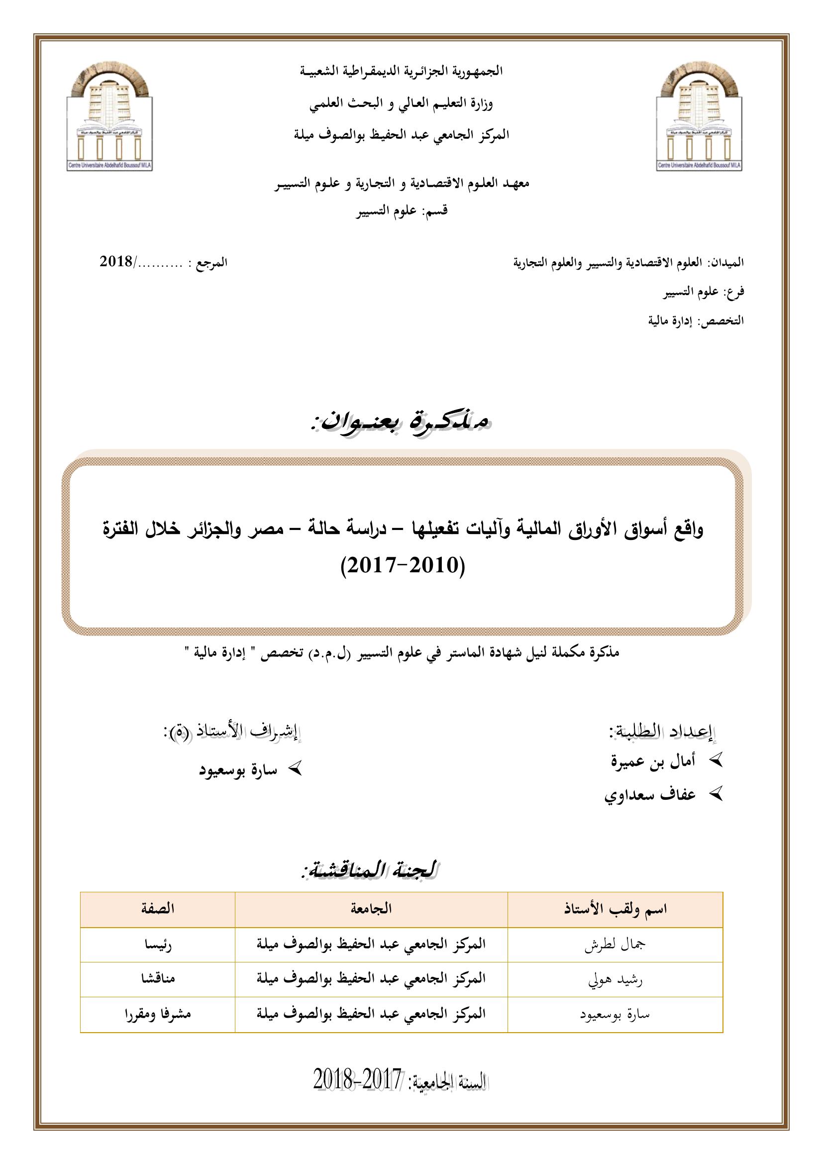 بن عميرة أمال & ،هبول محمد (رئيسا) ، حمودي حيمر( مناقشا) ، لطرش جمال (مشرفا ومقررا) (2018). واقع أسواق الأوراق المالية وآليات تفعيلها : دراسة حالة مصر والجزائر خلال الفترة (2010-2017).