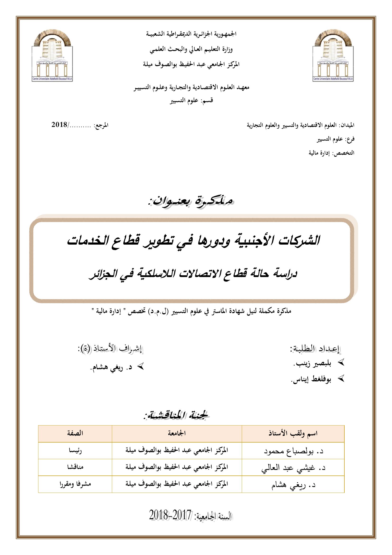 بلبصير زينب & بولصباع محمود (رئيسا) ، غيشي عبد العالي ( مناقشا) ، ريغي هشام(مشرفا ومقررا) (2018). الشركات الأجنبية ودورها في تطوير قطاع الخدمات : دراسة حالة قطاع الإتصالات اللاسلكية في الجزائر.