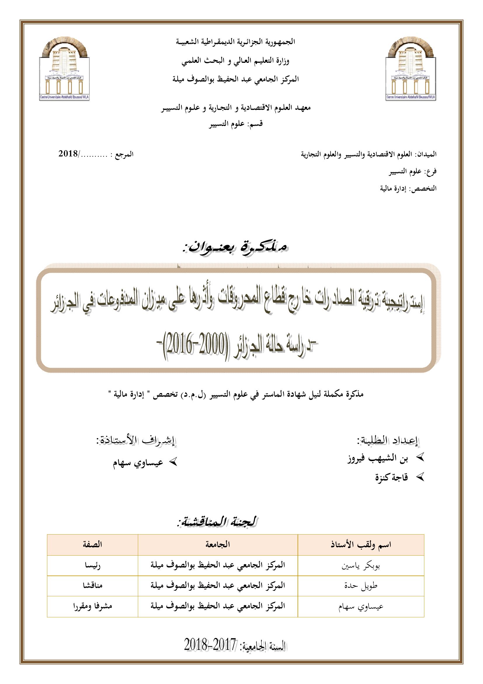 بن الشيهب فيروز & بوبكر ياسين (رئيسا) ، طويل حدة (مناقشا) ، عيساوي سهام(مشرفا ومقررا) (2018). إستراتيجية ترقية الصادرات خارج قطاع المحروقات وأثرها على ميزان المدفوعات في الجزائر : دراسة حالة الجزائر (2000-2016).