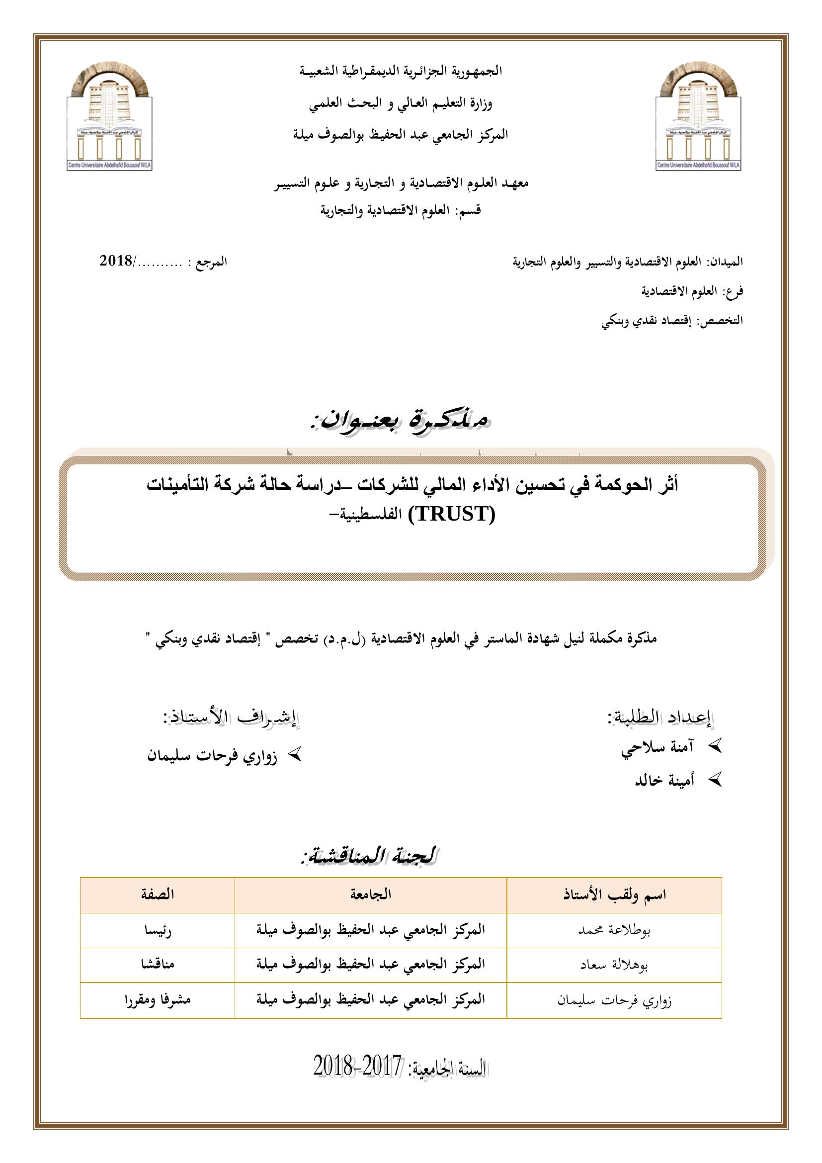 سلاحي آمنة & بوطلاعة محمد (رئيسا), ب. (2018). أثر الحوكمة في تحسين الأداء المالي للشركات: دراسة حالة شركة التأمينات TRUST الفلسطينية.