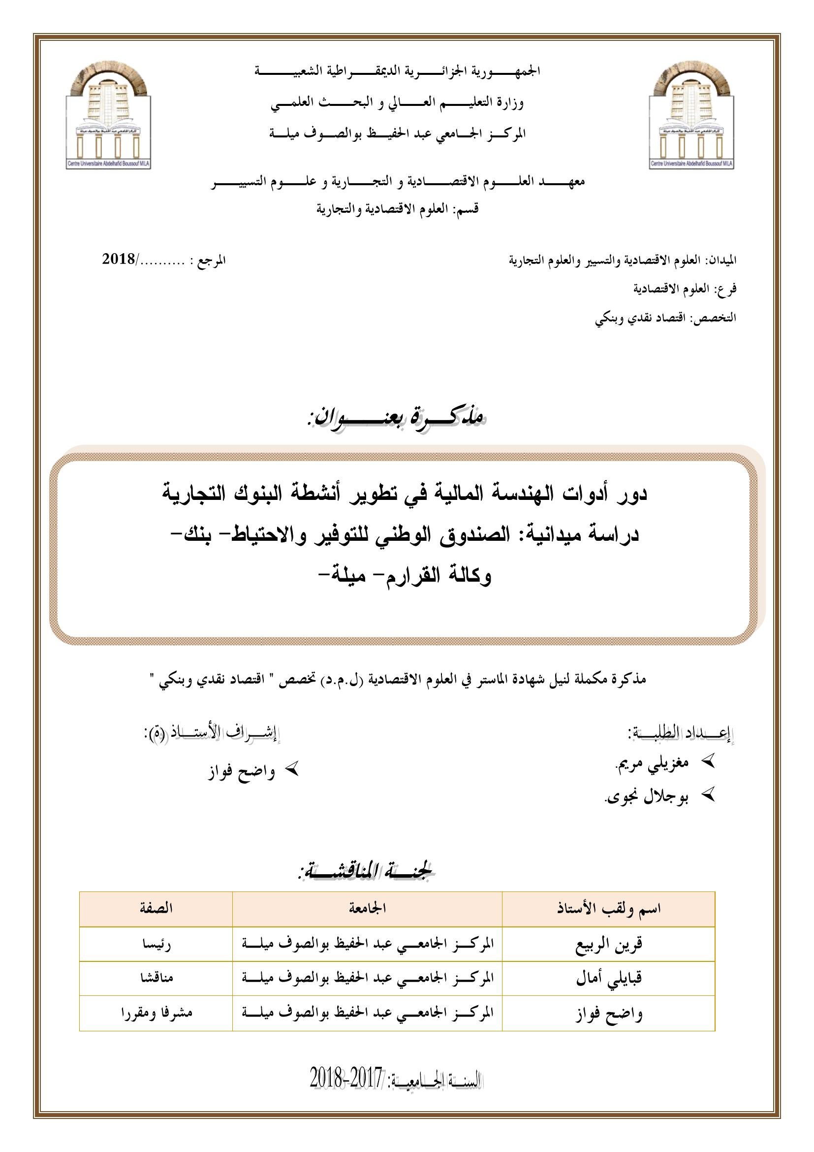 دور أدوات الهندسة المالية في تطوير أنشطة البنوك التجارية : دراسة ميدانية الصندوق الوطني للتوفير والاحتياط بنك وكالة القرارم ميلة