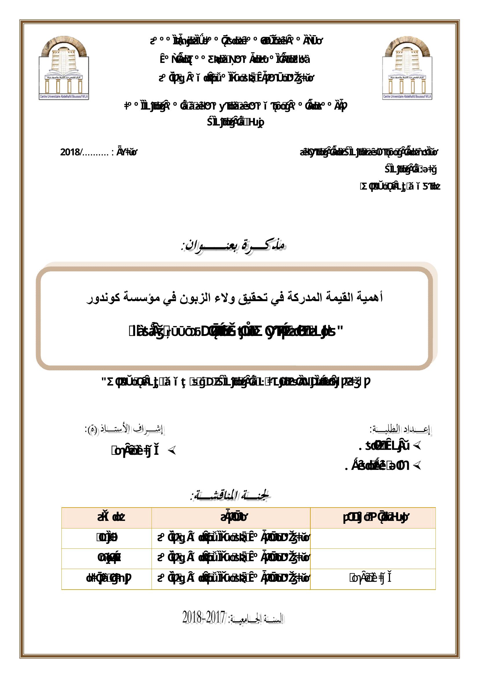 لموسي خالد & صكري أيوب(مشرفا و مقررا) (2018). أهمية القيمة المدركة في تحقيق ولاء الزبون في مؤسسة كوندور : دراسة حالة منتجات الهاتف النقال لمؤسسة كوندور.