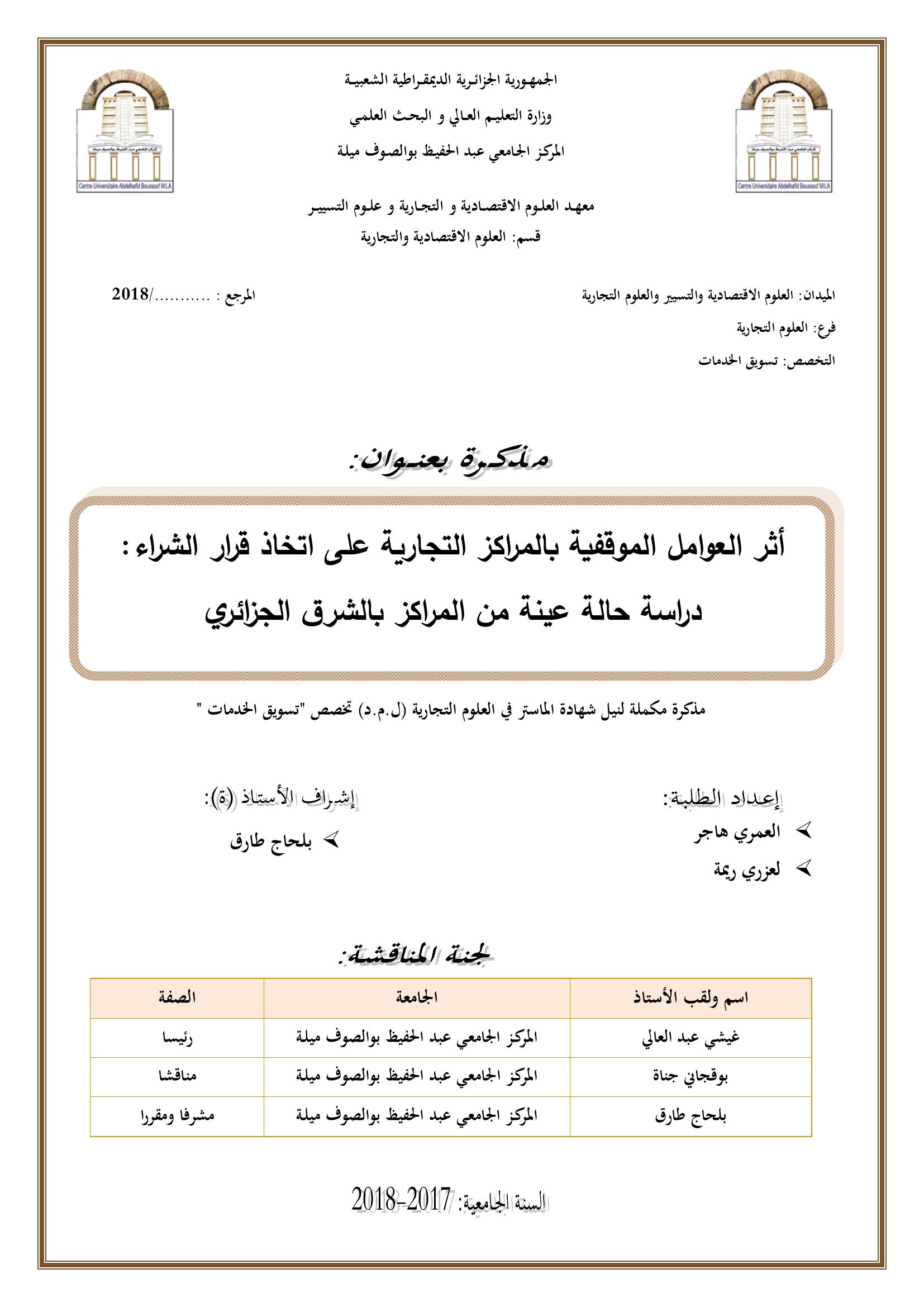 العمري هاجر & غيشي عبد العالي(رئيسا)،بوقجاني جناة(مناقشا)،بلحاج طارق(مشرفا و مقررا)، (2018). أثر العوامل الموقفية بالمراكز التجارية على اتخاد قرار الشراء : دراسة حالة : عينة من المراكز بالشرق الجزائري.