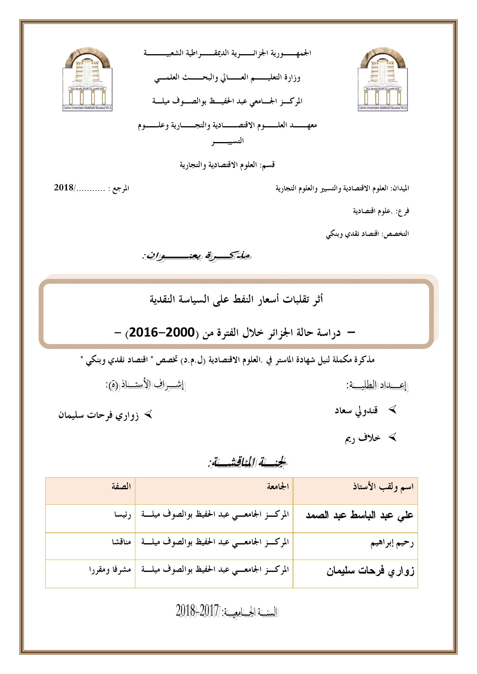 قندولي سعاد & علي عبد الباسط عبد الصمد(رئيسا)،رحيم إبراهيم(مناقشا)،زواري فرحات سليمان(مشرفا و مقررا)، (2018). أثر تقلبات أسعار النفط على السياسة النقدية : دراسة حالة الجزائر خلال الفترة من (2000-2016).