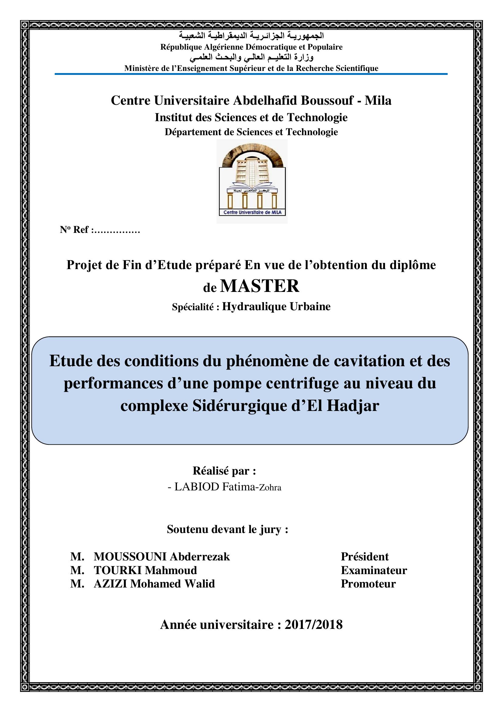 labiod fatima zohra & M. Moussouni abderrezak (président). M.Tourki mahmoud (examinateur). M.azizi mohamed walid (promoteur) (2018). Etude des conditions du phénoméne de cavitation et des performances d'une pompe centrifuge au niveau du complexe sidérurgique d'el hadjar.