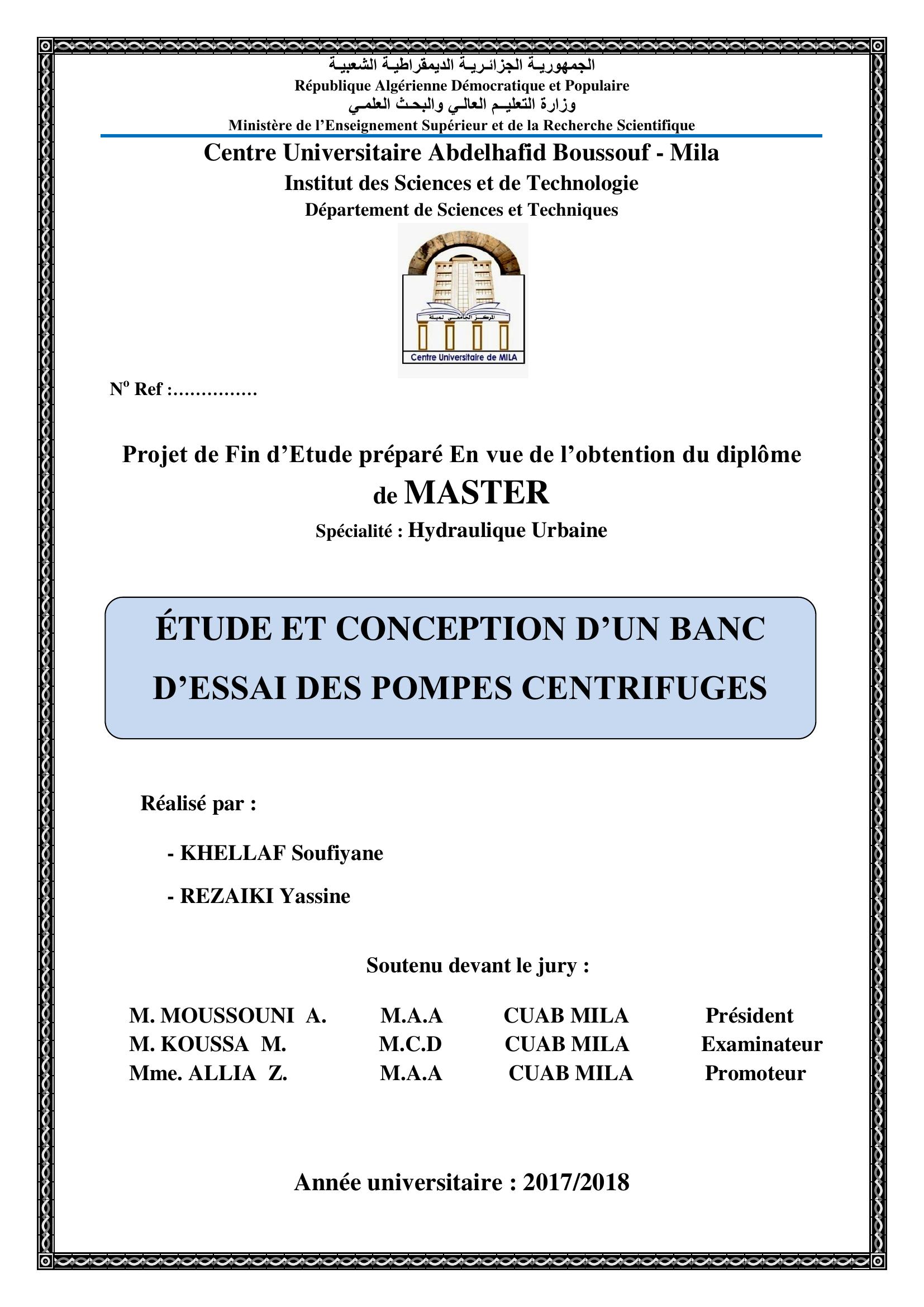 KHELLAF soufyane & M.moussouni A (président ), M. (2018). Etude et conception d'un banc d'essai des pompes centrifuges.