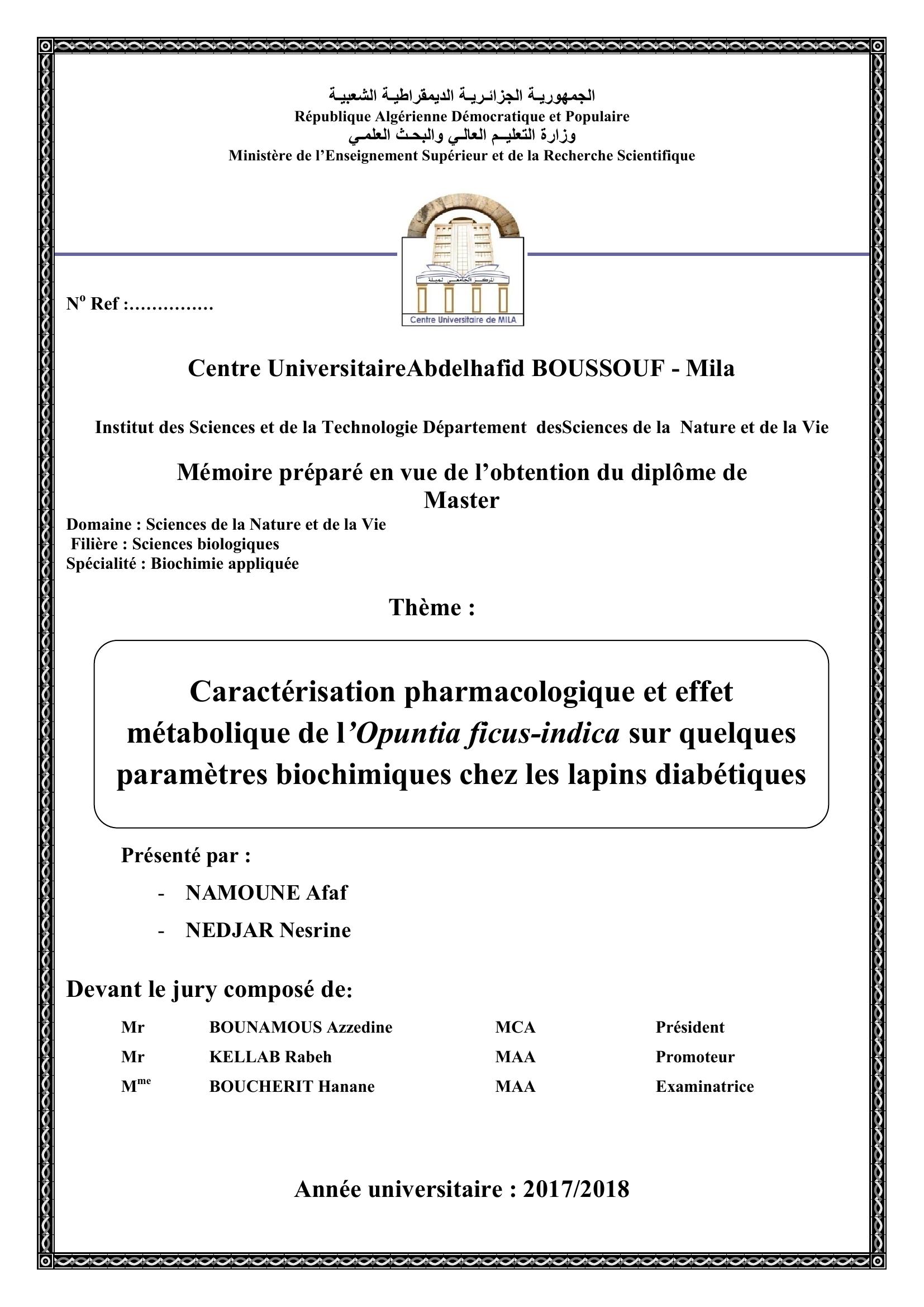 Namoune afaf & Bounamous azzedine(président), K. (2018). Caractérisation pharmacologique et effet métabolique de l' opuntia ficus-indica sur quelques paramètres biochimiques chez les lapins diabétique.