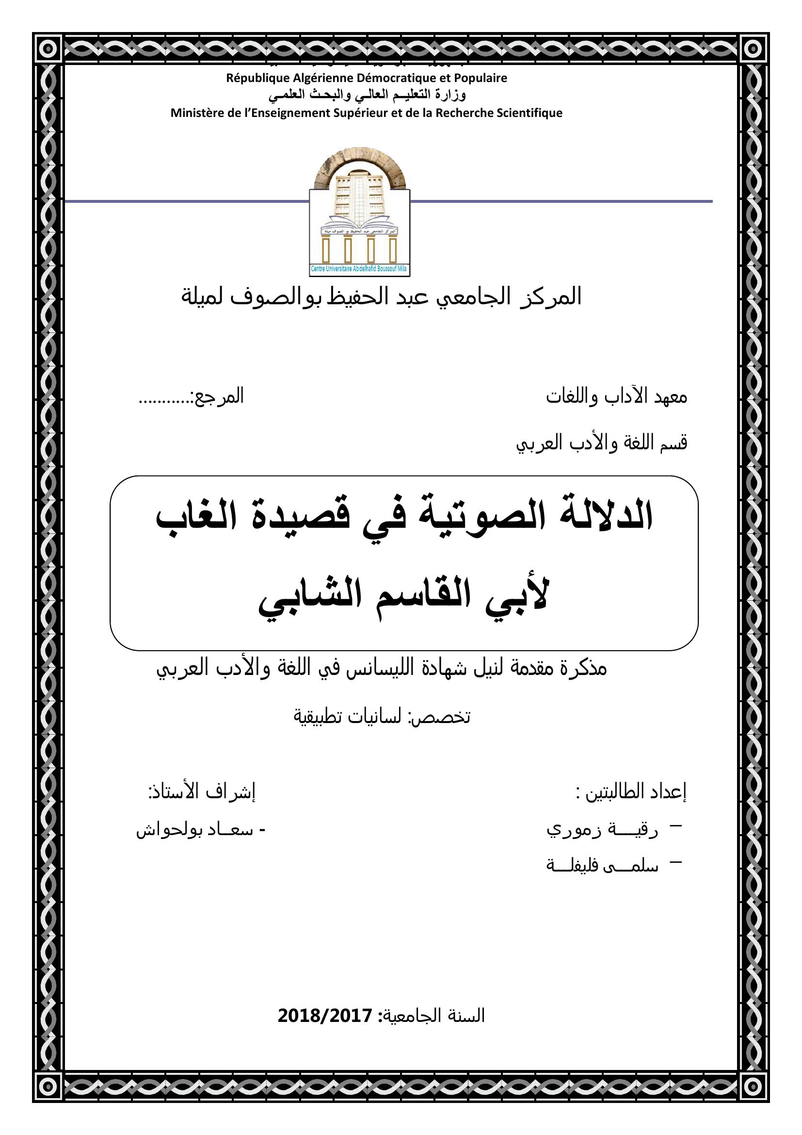 زموري رقية & بولحواش سعاد (مشرفا ) (2018). الدلالة الصوتية في قصيدة الغاب لأبي القاسم الشابي.