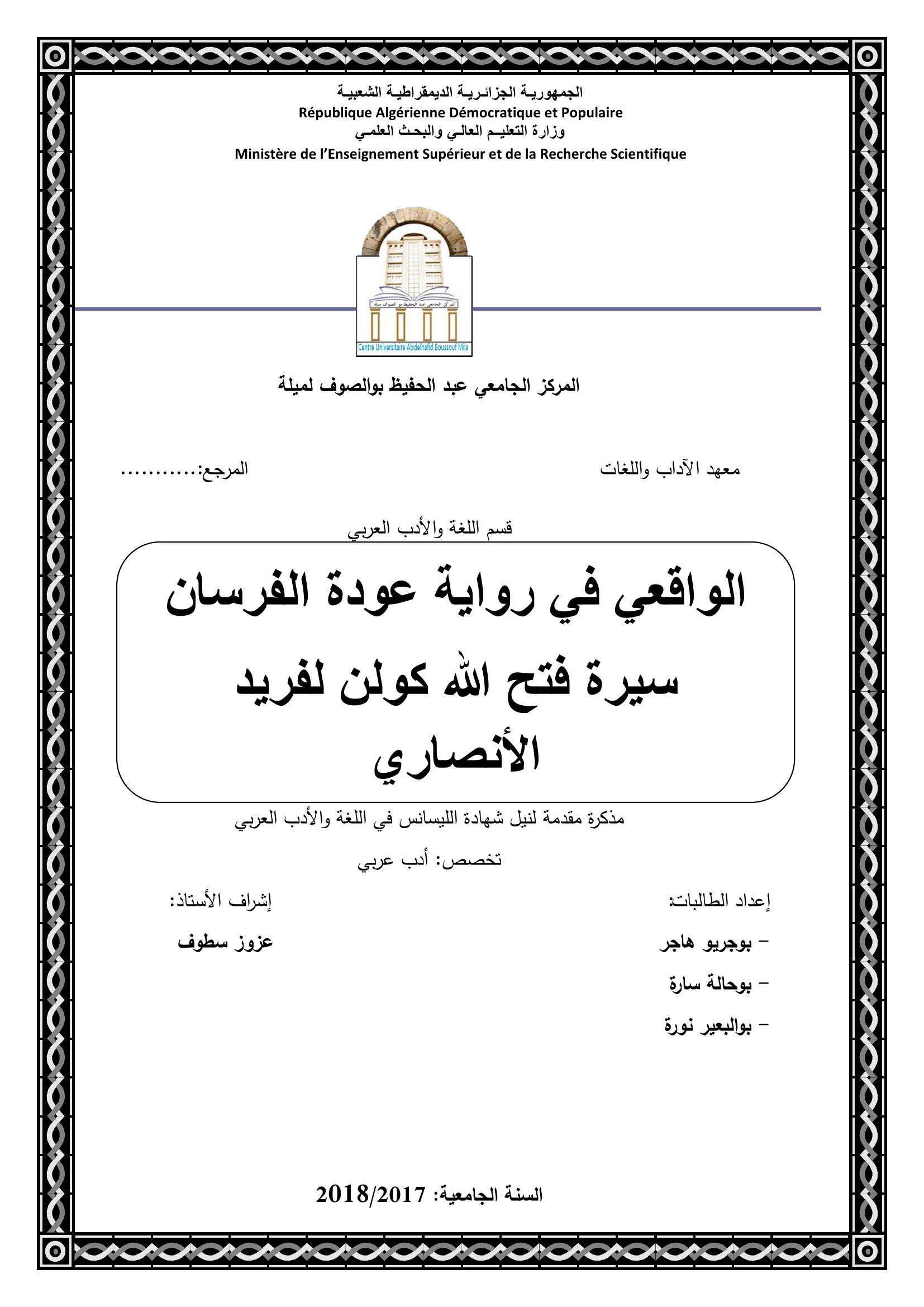 بوجريو هاجر & عزوز سطوف(مشرفا) (2018). الواقعي في رواية عودة الفرسان سيرة فتح الله كولن لفريد الأنصاري.