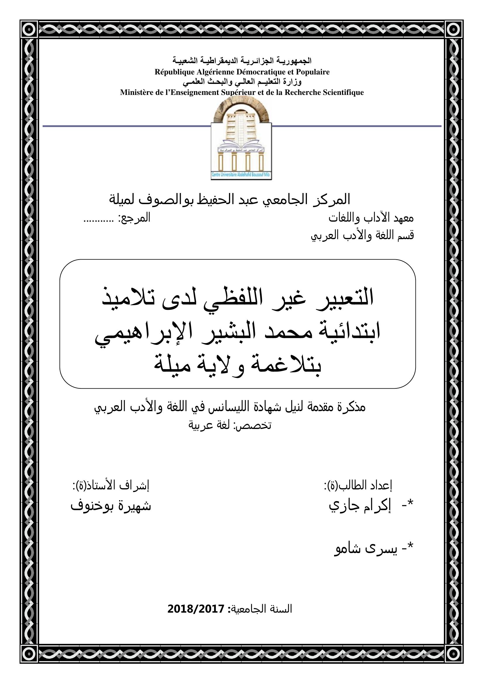 إكرام جازي & بوخنوف شهيرة (مشرفا) (2018). التعبير غير اللفظي لدى تلاميذ ابتدائية محمد البشير الإبراهيمي بتلاغمة ولاية ميلة.