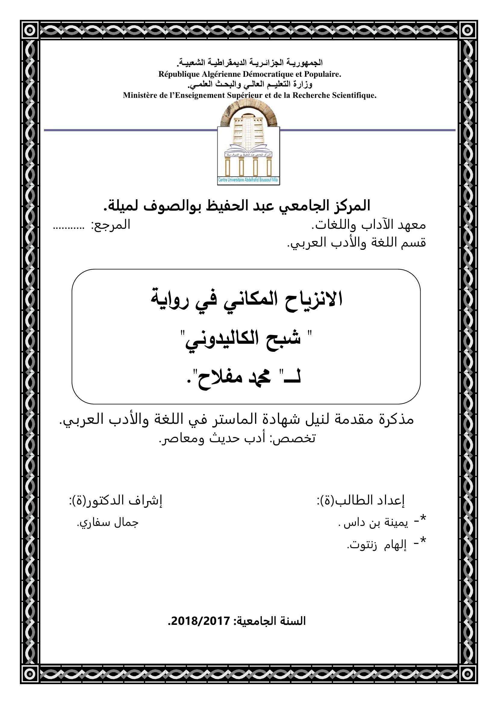 بن داس يمينة & سفاري جمال (مشرفا) (2018). الإنزياح المكاني في رواية شبح الكاليدوني لـ محمد مفلاح.