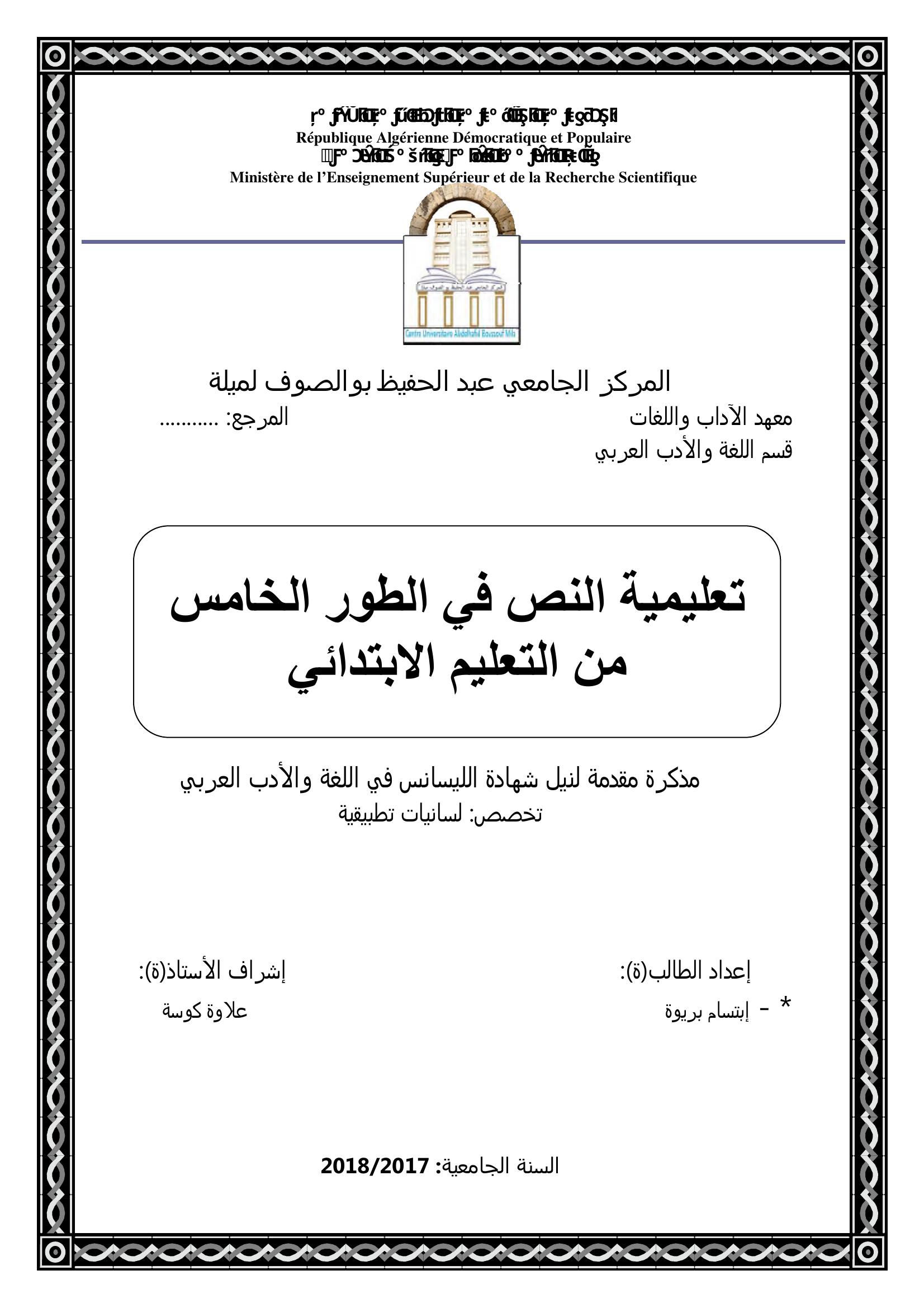 إبتسام بريوة & علاوة كوسة(مشرفا) (2018). تعليمية النص في الطور الخامس من التعليم الابتدائي.